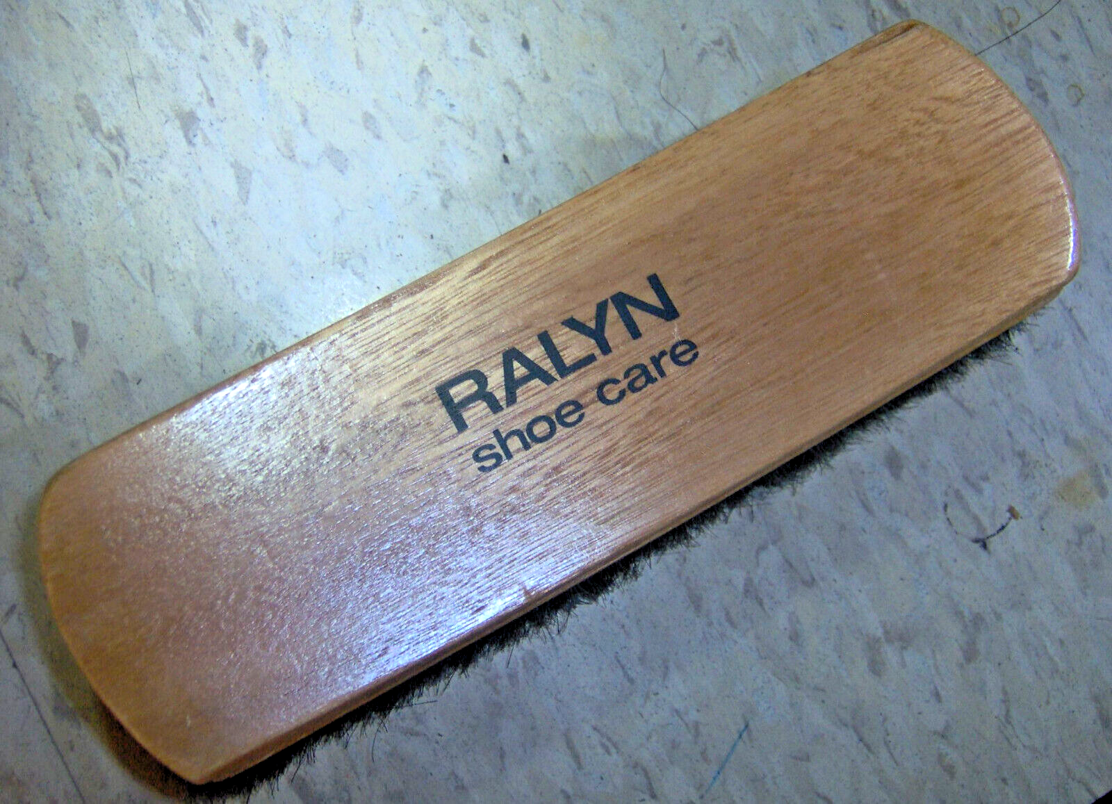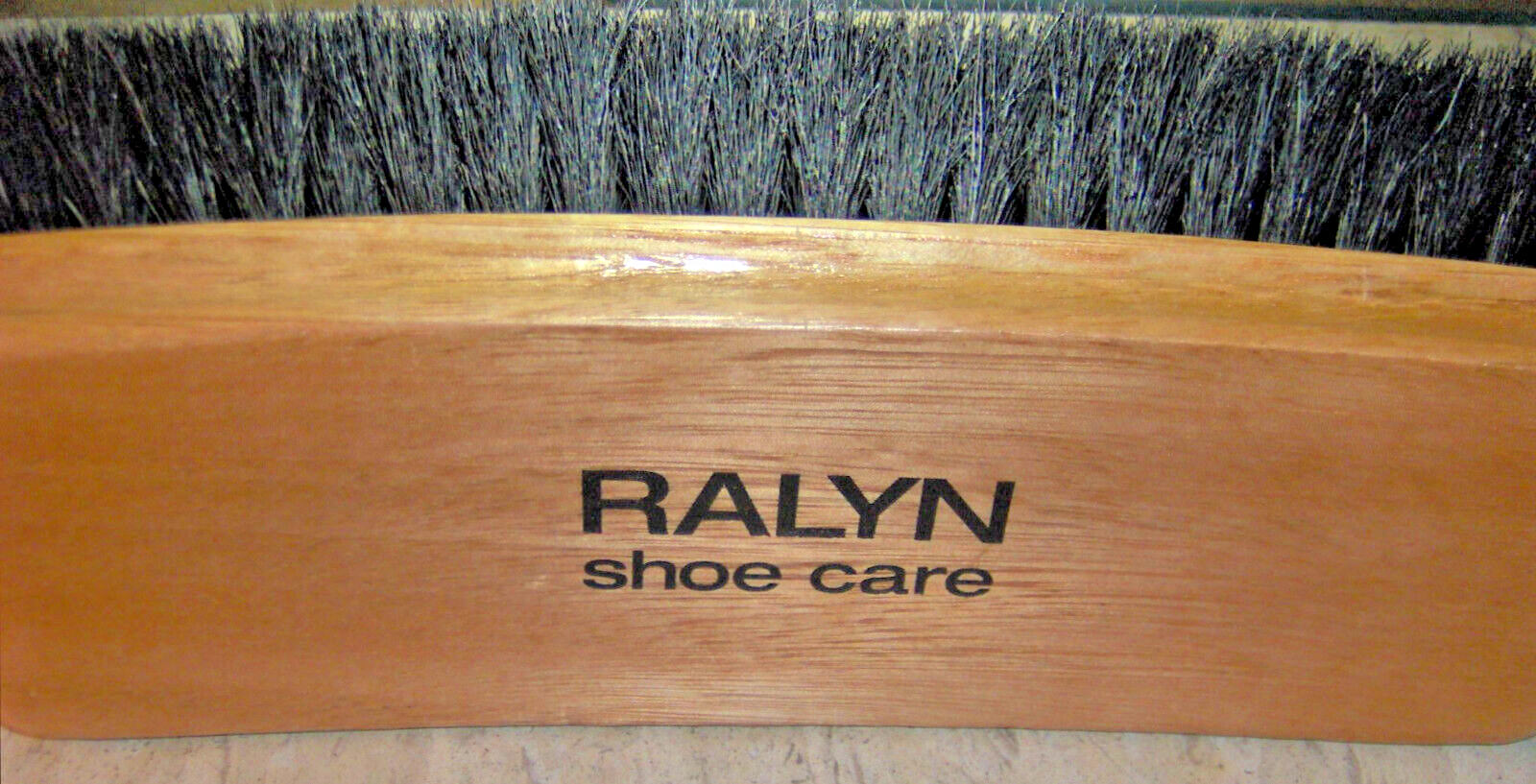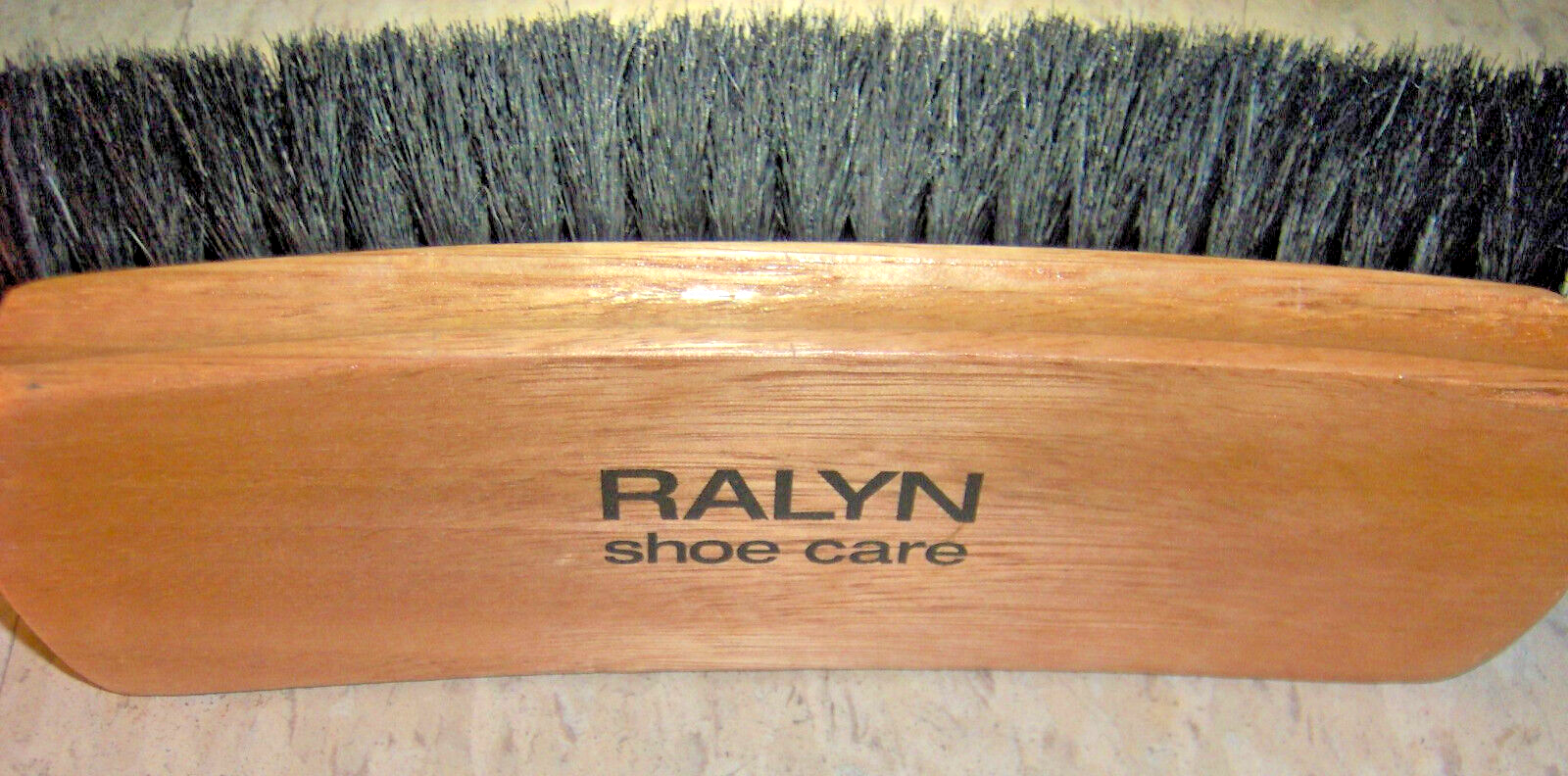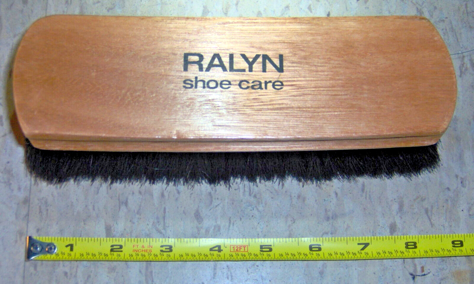 FOR SALE IS ONE (1) NEW LARGE 8" PROFESSIONAL SIZE 100% HORSEHAIR DARK BLACK COLOR BRISTLES SHINE BRUSH FOR SHOES, BOOTS, HANDBAG, LEATHER GOODS, ETC MANUFACTURED BY RALYN BRAND. GENUINE RALYN BRAND PRO SIZE WITH ROBUST AND DENSE, 100% DARK BLACK HORSEHAIR BRISTLES, SUITABLE FOR USE ON DARKER ITEMS (black and brown), 1 1/2" length NATURAL FIBER BRISTLES, SOLID WOOD BLOCK LACQUERED HANDLE MEASURES 8" length x 2 1/2" width. THE GENTLY CONCAVE SLOPED WOOD HANDLE IS ERGONOMIC, WITH EASY TO GRIP INDENTS ON THE LEFT AND RIGHT SIDES, MAKING A FIRM GRIP EASIER AND SAFER. THIS PROFESSIONAL QUALITY SHINE BRUSH STANDS 2 1/2" tall WITH 1 1/2" length BLACK color FULL LENGTH HORSEHAIR BRISTLES. THIS 100% ALL HORSEHAIR SHOESHINE BRUSH MAKES IT IDEAL FOR YOUR SHINE BOX.. THIS PREMIUM STAR BRAND SHINE BRUSH FEATURES A SOLID HARDWOOD HANDLE WITH A DENSE INVENTORY OF 1 1/2" length, DARK BLACK color GENUINE HORSEHAIR BRISTLES. THE DARK color BRISTLES ARE RECOMMENDED FOR USE WITH DARKER COLOR POLISH. KEEP YOUR LEATHER SHOES, BOOTS, OR ANY LEATHER ITEM LOOKING THEIR BEST WITH THIS PREMIUM QUALITY, NATURAL FIBER, ALL HORSEHAIR SHINE BRUSH. THIS GENUINE RALYN BRAND PROFESSIONAL SIZE HORSEHAIR BRUSH IS THE GOLD STANDARD FOR SHOE SHINE BRUSHES AND DELIVERS THE HEAT REQUIRED TO WORK POLISH INTO THE LEATHER AND DELIVER THE DESIRED SHINE. A QUALITY SHINE BRUSH IS A REQUIRED TOOL FOR ANY GROWN ADULT. YOU WILL RECEIVE ONE (1) PROFESSIONAL 8" DARK COLOR SHINE BRUSH BY RALYN BRAND SHIPPED BY USPS.....