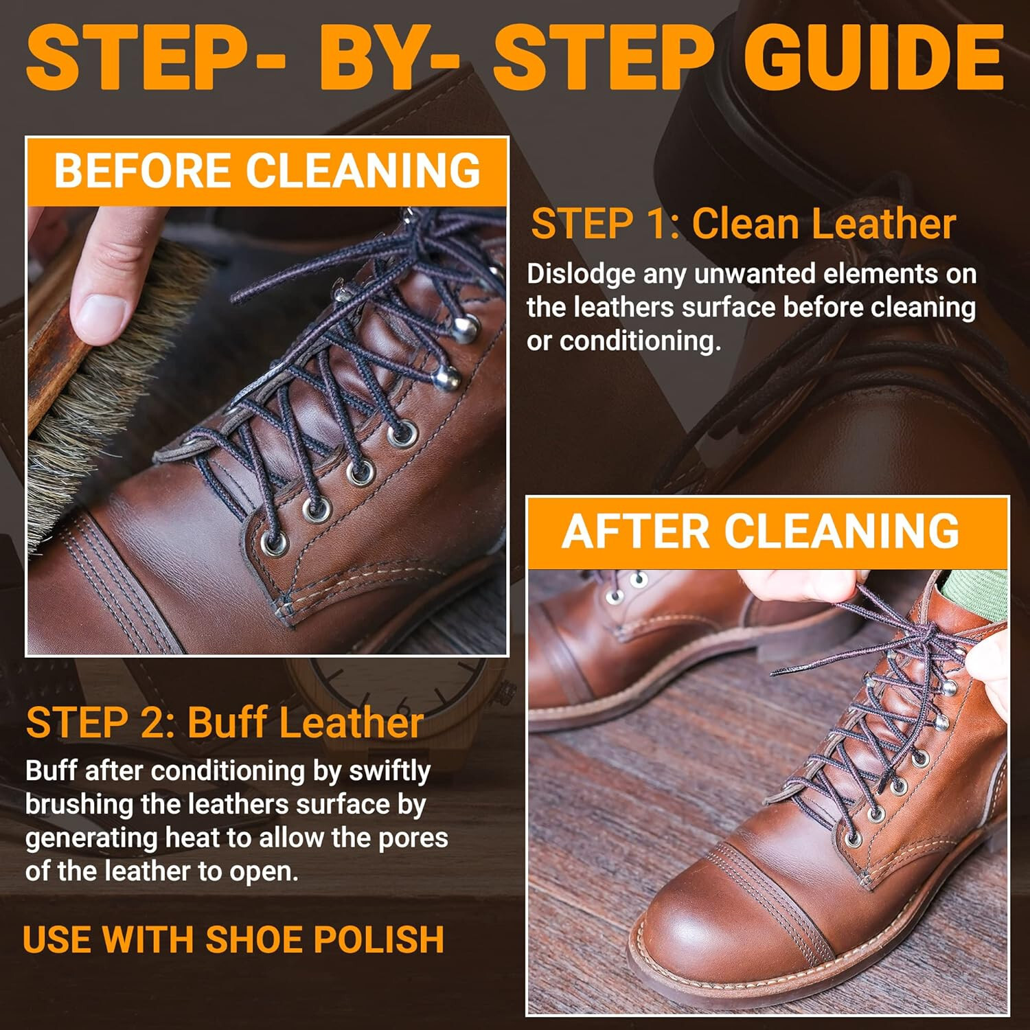 note.... the main function of any shoe shine brush is to brush off excess polish and work the remaining polish into the leather with heat created by the brush, accomplished with a fast back and forth wrist action. a natural fiber brush is always recommended, and will not scratch your application surface. a quality natural fiber bristle brush will deliver an even finish with a slight shine. if desired, you may now buff your shoes with an old cotton t shirt or chamois to gain a better shine, again natural fiber is recommended to prevent scratching.