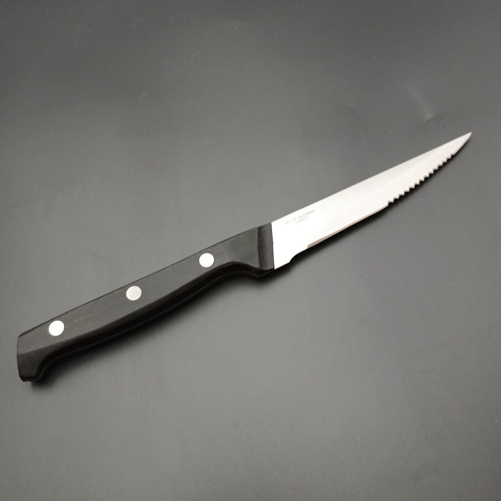 This set of four Calphalon CLASSIC 4.5" steak knives is a must-have addition to any kitchen. The knives feature a serrated blade edge, making them suitable for cutting through meat, vegetables, fruit, and even salad. The black stainless steel material ensures durability and resistance to stains, while the tapered edge provides a comfortable grip.
