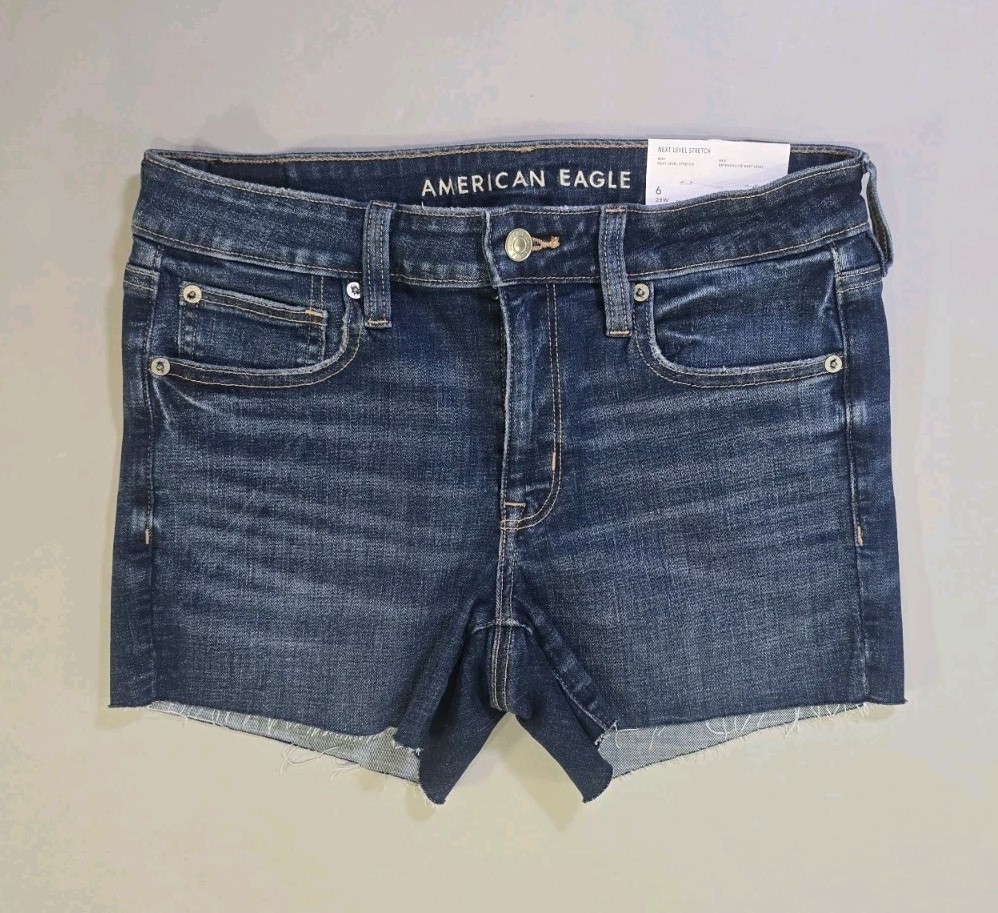 The product is a pair of American Eagle Women's Next Level Low Rise Midi denim shorts in size 6. These shorts feature a zip closure, embroidered accents, a low rise fit, a 3.5-inch inseam, and a 5-pocket design. They are made of a cotton blend denim fabric with a medium wash, solid blue color, and belt loops for a flattering fit. Perfect for casual occasions during the summer, fall, and spring seasons, these shorts are both stylish and comfortable, making them ideal for various activities like walking, beach outings, and school.