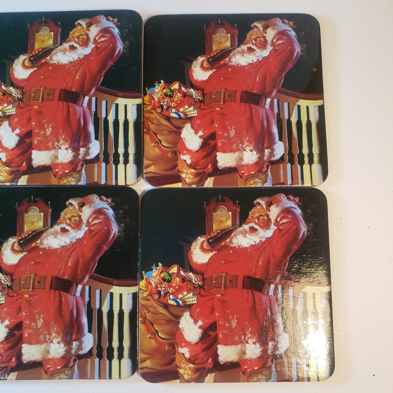 The product is a set of 8 Coca-Cola vintage Santa coasters from 1999. These coasters feature a multi-color design with Santa Claus depicted on them, embodying the theme of soda. The Coca-Cola brand is prominently featured, making them a collectible advertising item related to soda. The coasters likely hold nostalgic value and represent a piece of Coca-Cola's history and holiday-themed merchandise.