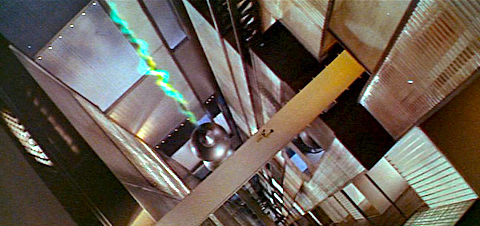 A bolt of energy writhes through a vast Krell ventilator shaft as visitors enter the system in this widescreen scene from the 1956 sci-fi classic.