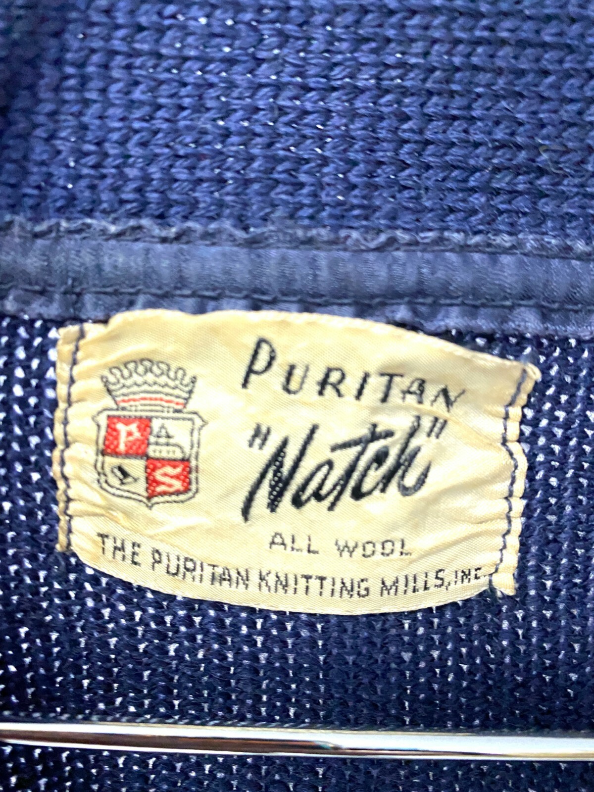 Vintage 1940s?50s wool letterman cardigan sweater by Puritan Natch, made for Montoursville, Pennsylvania High School. Features a classic button-front design with ribbed hem and cuffs, knit in sturdy wool. A well-preserved example of mid-century American school spirit wear.