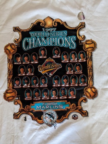 Up for sale is a new old stock Vintage 1997 Florida Marlins Starter T Shirt MLB World Series Champions USA Team Photo Size Large.
