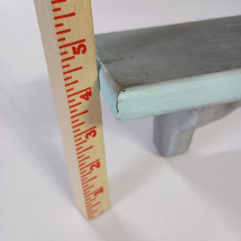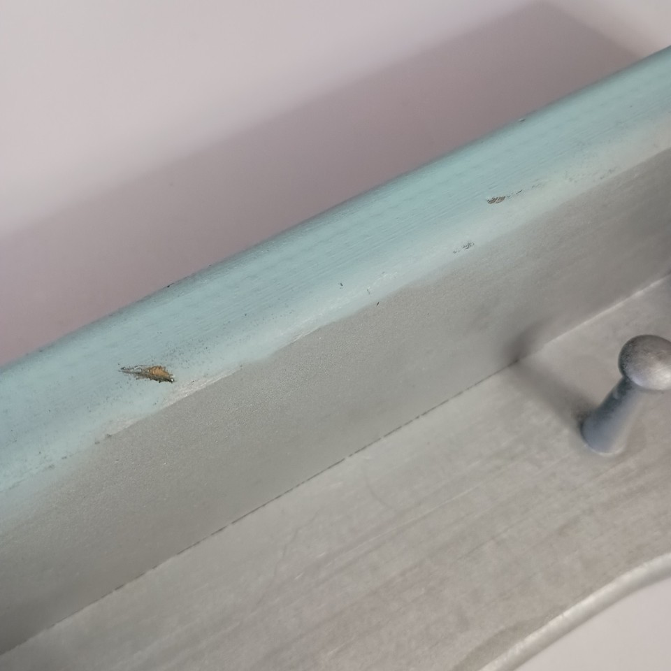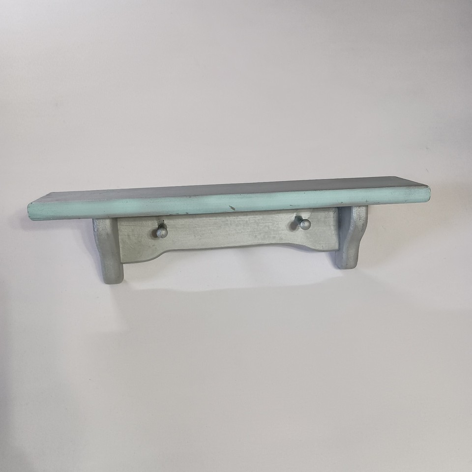This small wood wall hanging farmhouse shelf with 2 pegs is 16" long, perfect for displaying knick knacks in various rooms of your home. The blue and silver paint finish gives it a rustic vintage farmhouse cabin decor look, making it suitable for teens, adults, and kids. Handcrafted in the United States, this wall-mounted shelf is made of solid wood. Normal wear. Sizes are approximate.