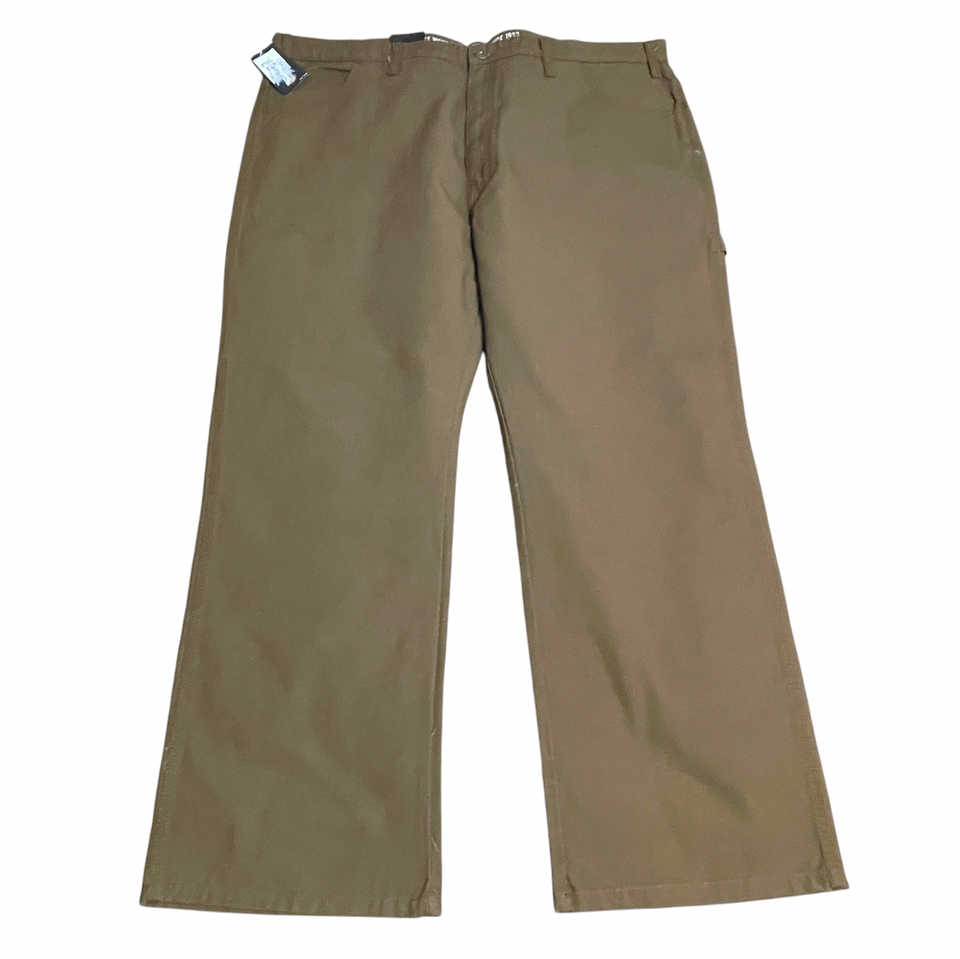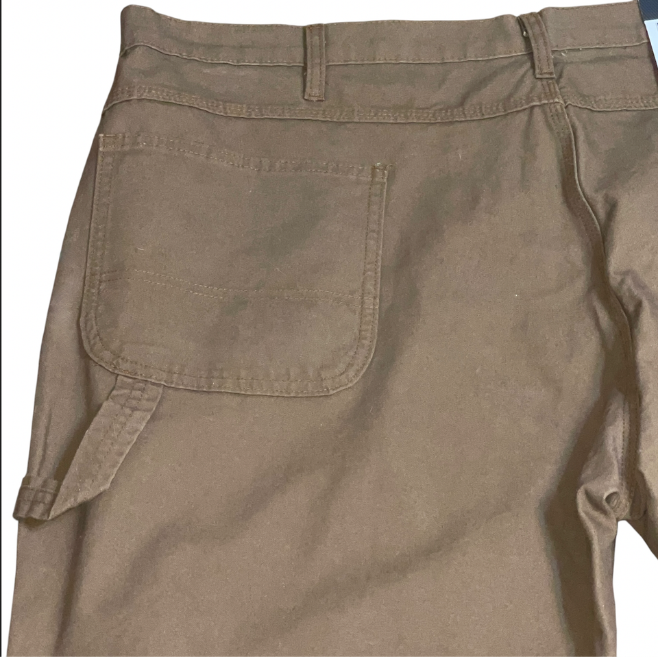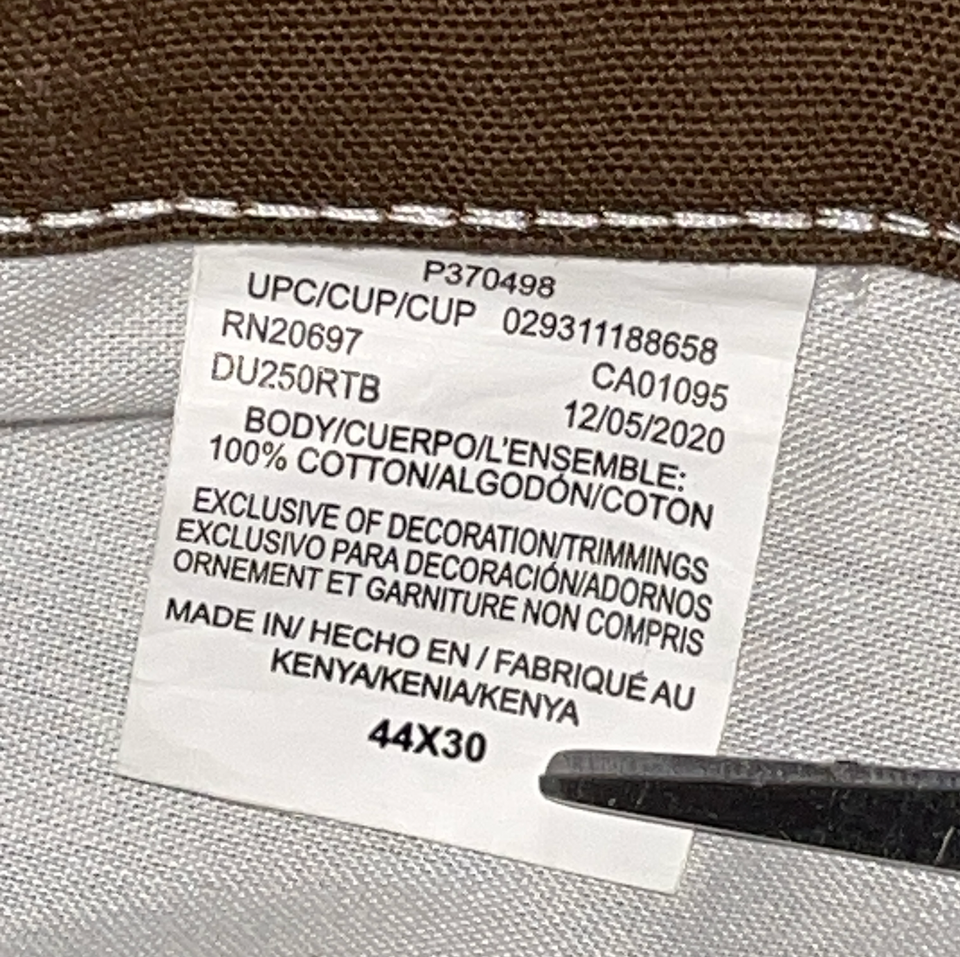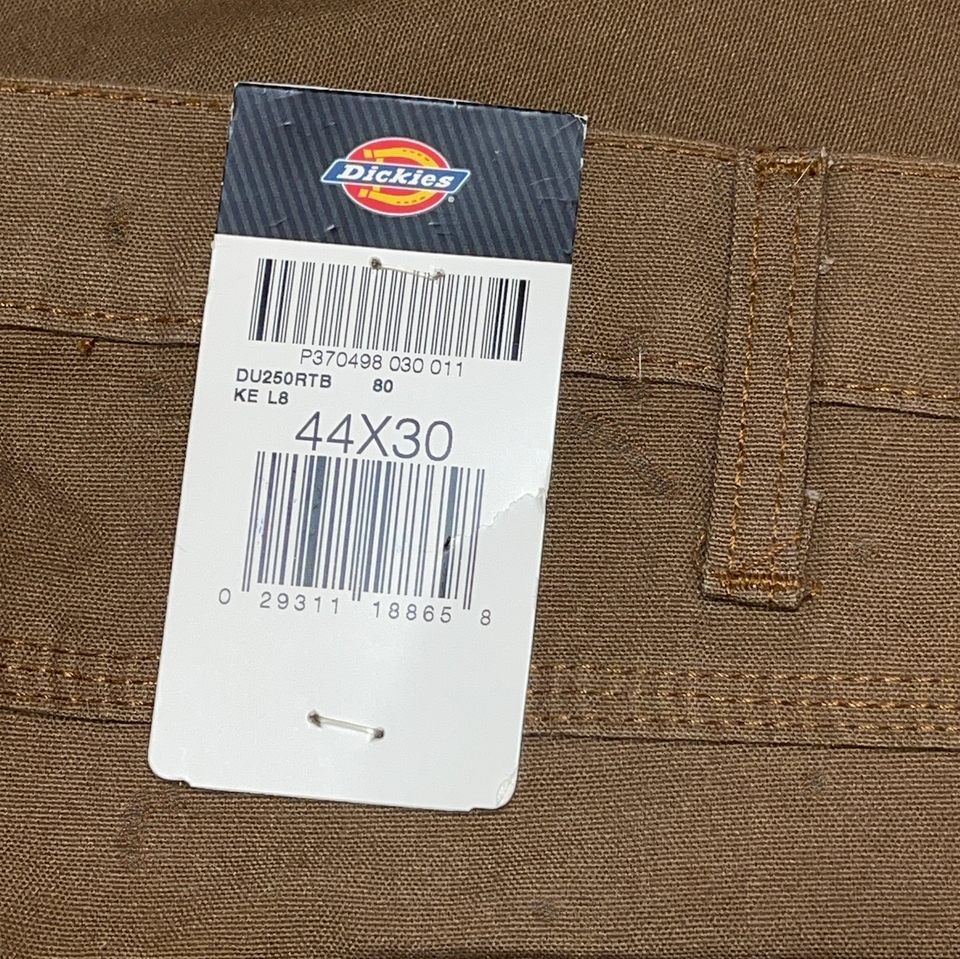 New with tags. The back of the pant leg cuffs have very light marks. Size tag 44 waist by 30 inseam, full measurements in photos. Features: Carpenter duck jean, relaxed fit, straight leg. These are a dark brown color. Please see all gallery photos. We are a smoke free, pet friendly home. Have a great day!