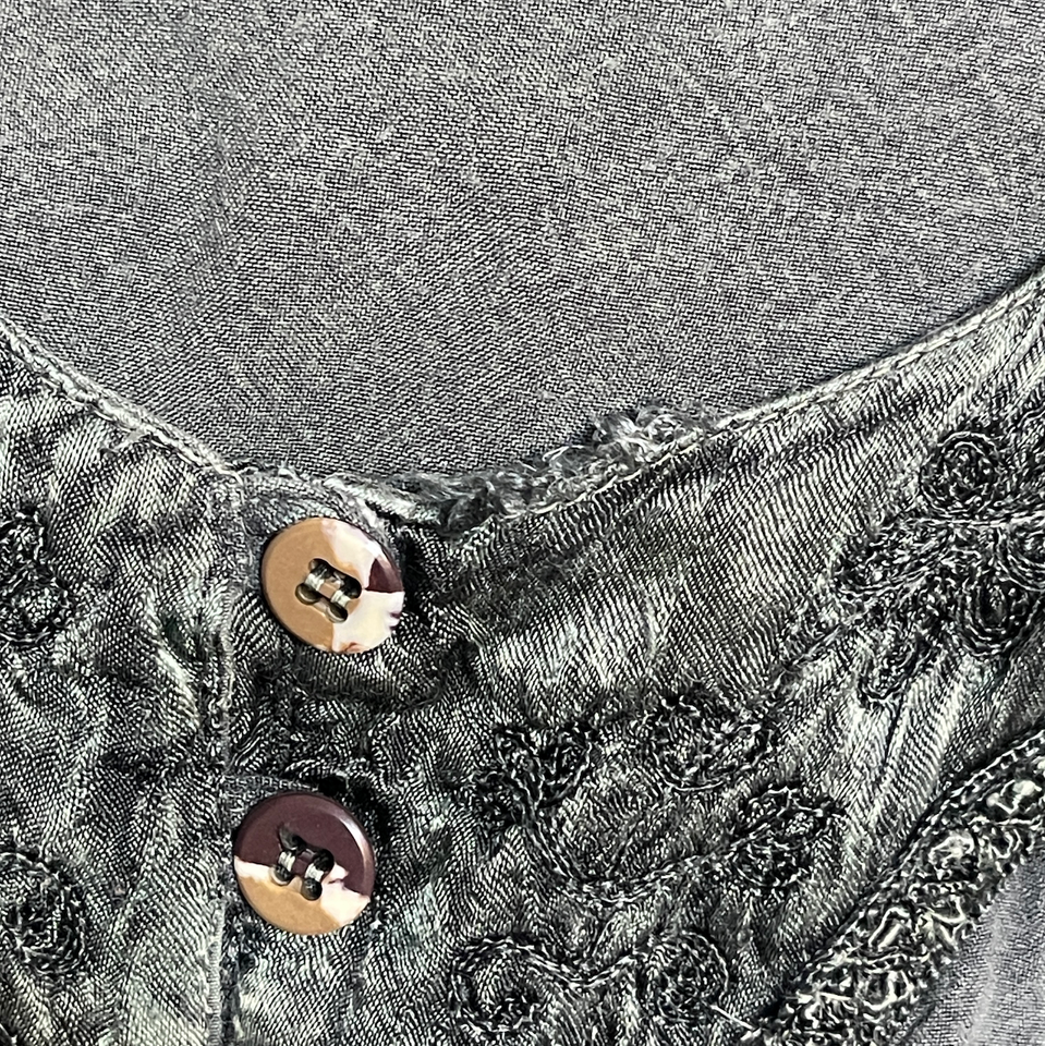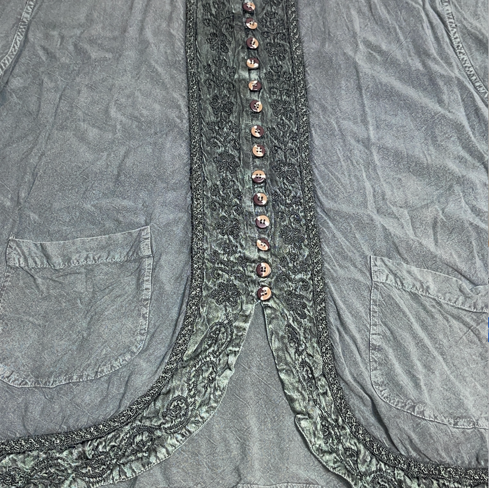 This Holy Clothing tunic top shirt in a plus size 4X features a solid green color with embroidered accents, giving off a fairy-like and bohemian vibe. Made of viscous material, this pullover blouse is collarless and easy to care for, making it a versatile piece for the summer, fall, and spring seasons. Perfect for those who appreciate nature-inspired fashion with a touch of hippie and bohemian style. Would look super cute with a pair of leggings! There is a small area of fray on top near top button (see photos). Size tag 4X 4 extra large. Measures 28.5 inches across the chest, 31.5 inches overall length, and 22 inch sleeve length. Please see all gallery photos. We are a smoke free, pet friendly home. Have a great day!
