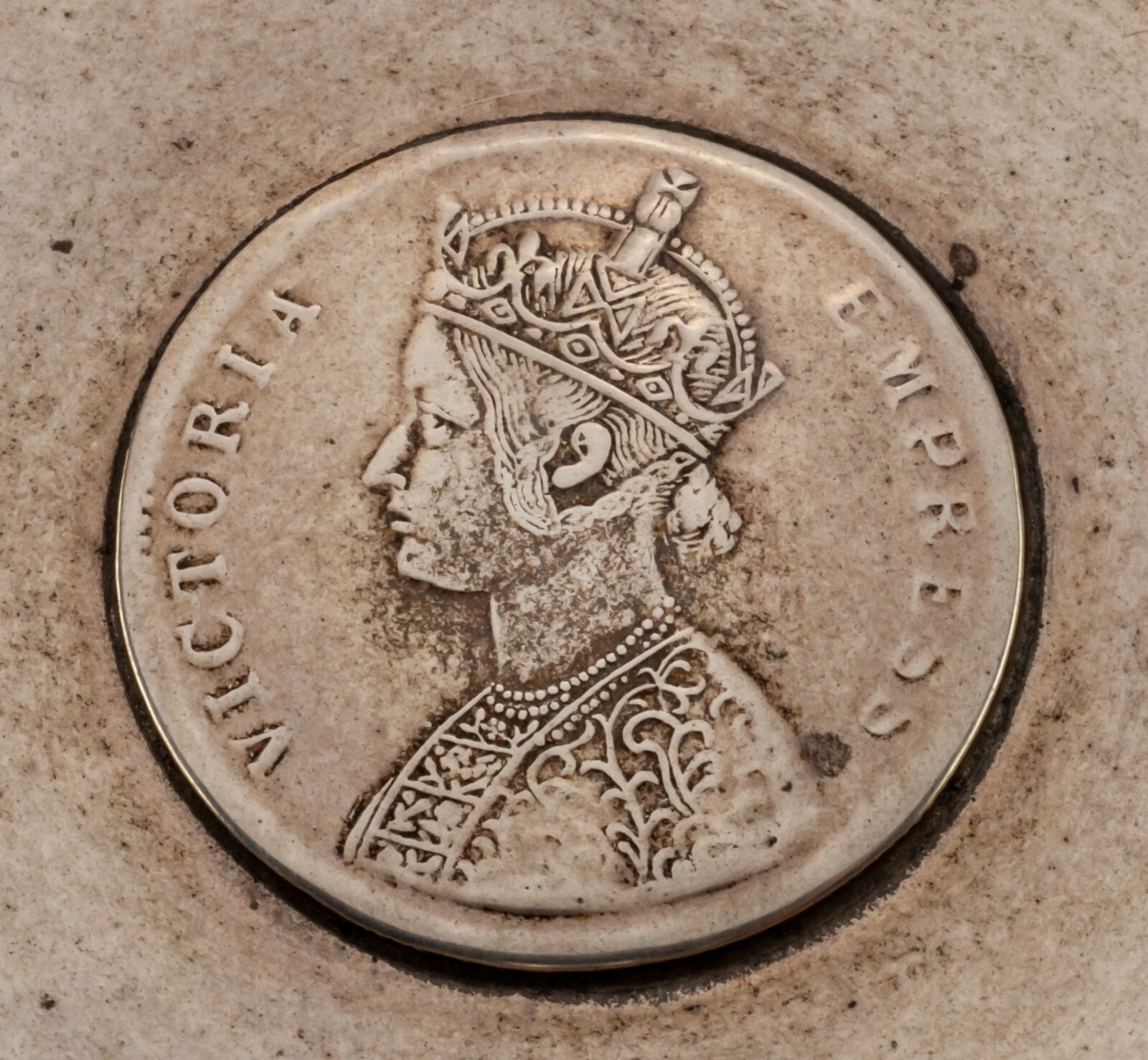 Comprend des pieces d'origine au centre de chaque plat. Le premier plat contient une piece de monnaie en Roupe en Roupe India-British montrant la reine Victoria d'un cote et une valeur dans la couronne de l'autre. Le deuxieme plat est une piece de roupie en Rupee en Inde de 1907 avec le roi Edward VII.