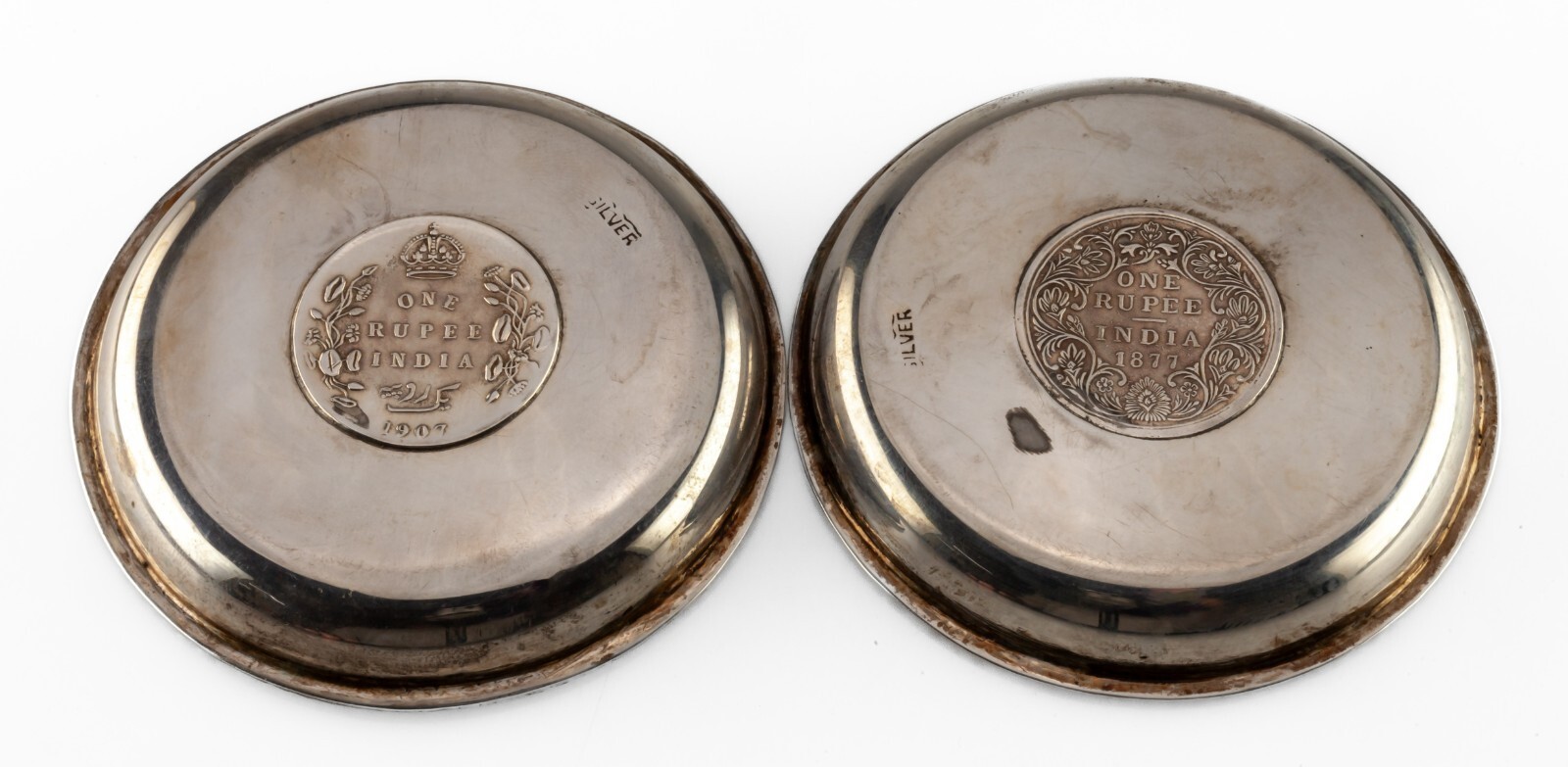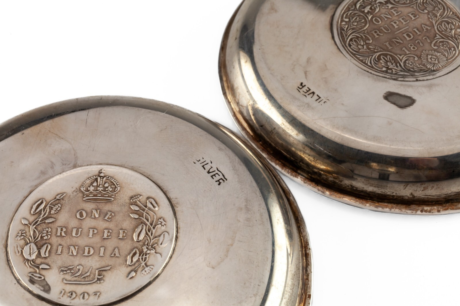 Paire des plats argentes indiens, 1877 et 1907 One Rupee Coin