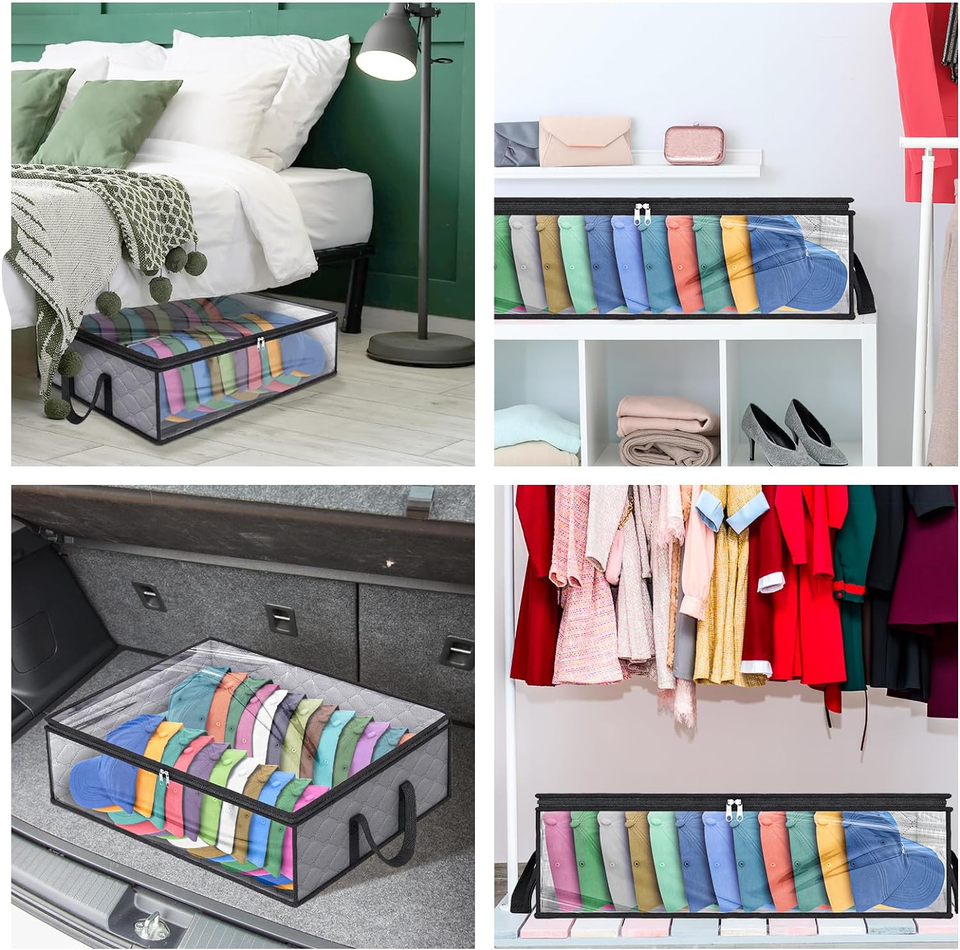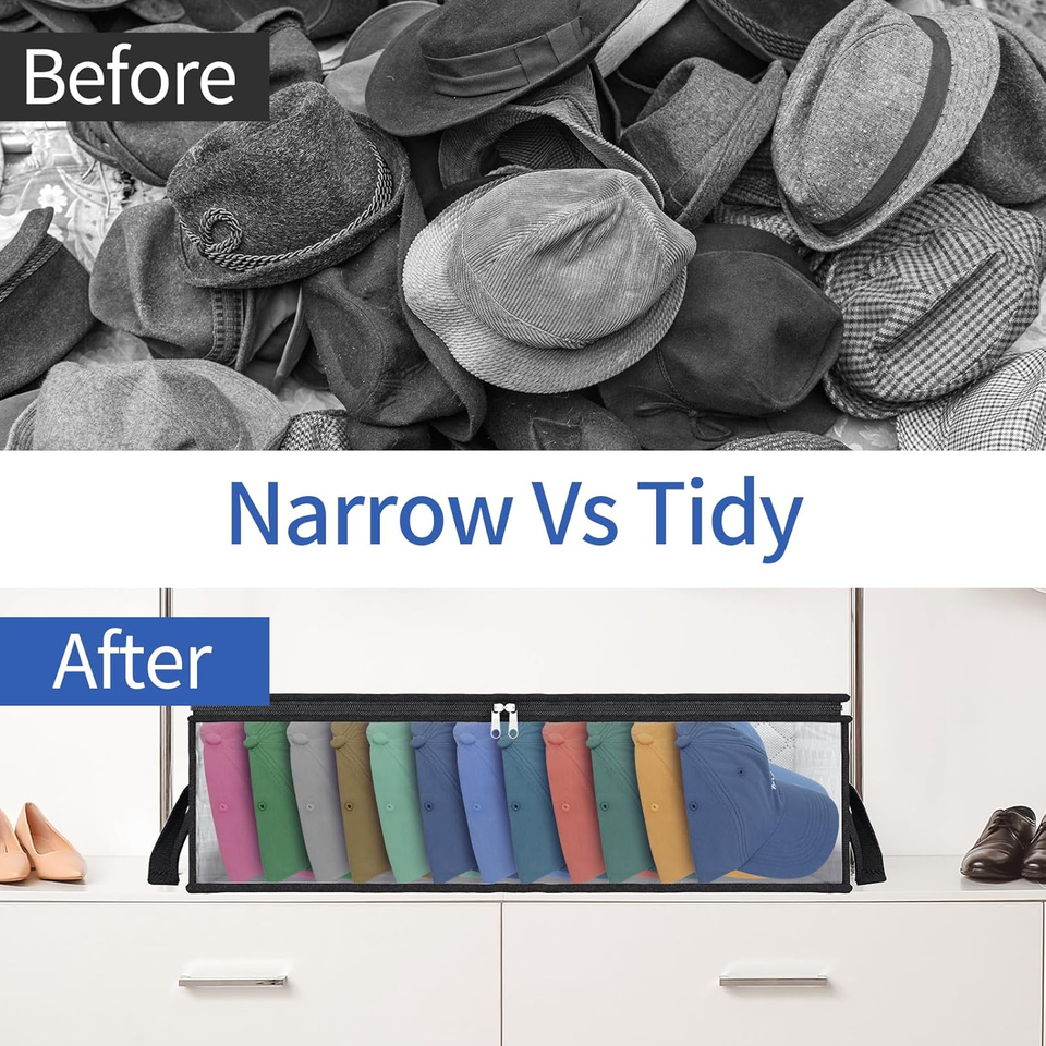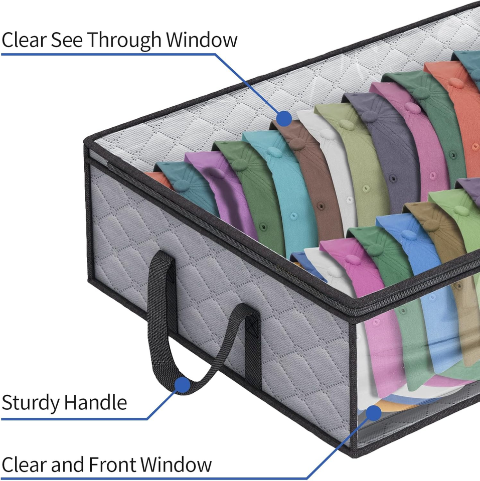 Large Capacity: The size of the storage bag is 20"L x 16"W x 6.7"H, which is enough to organize 40 baseball caps or caps backwards. The hat box is also suitable for storing flat brim, trucker cap, golf hat, beisbol hat, etc