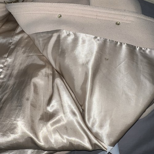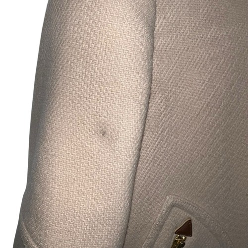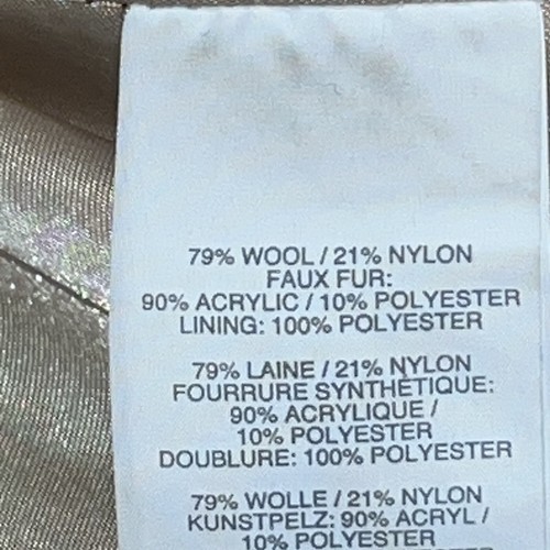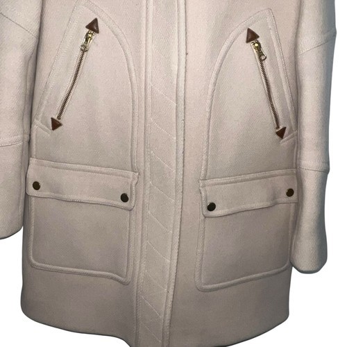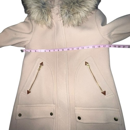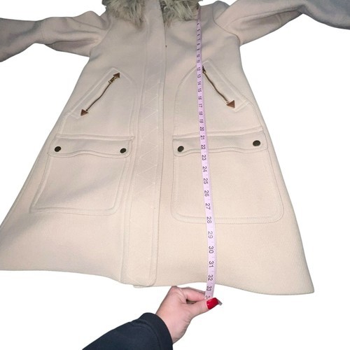 This J. Crew Chateau Parka is a stylish and classic coat made of Italian Stadium Cloth Wool in a beige color. It features a fur-trimmed hood, full zip closure, zipped pockets, and a mid-length design. The coat is lined with polyester for added warmth and comfort, making it suitable for winter, fall, and spring seasons. Perfect for travel, parties, workwear, or casual occasions, this coat is designed for a woman in size 2 Tall.