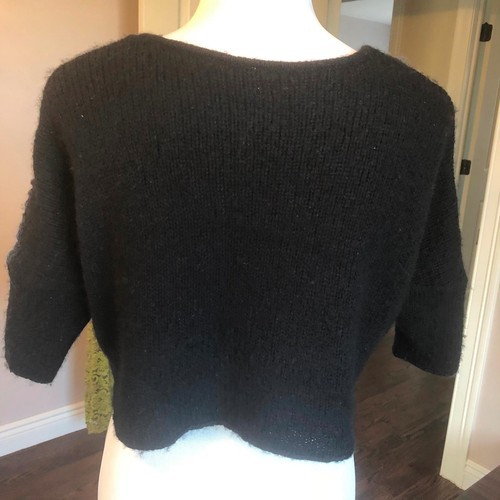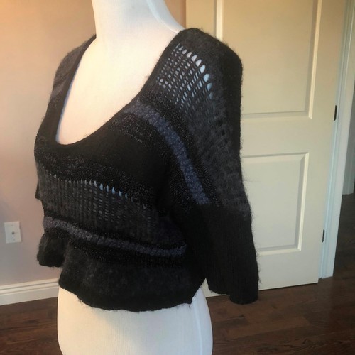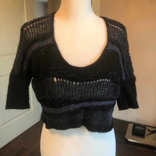 Laid flat this open knit cropped sweater measures: 17'' shoulder to shoulder, 40'' bust, 14.5'' in length