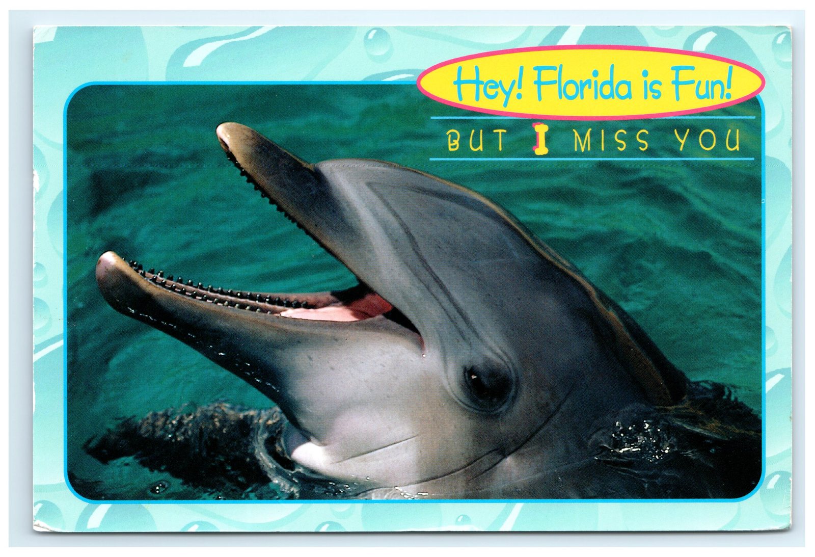This vibrant postcard features a close-up photograph of a smiling dolphin peeking out of the clear blue water, capturing the playful spirit of Florida's coastal wildlife. The front of the card is bordered by a bubbly aqua design and includes the cheerful caption, "Hey! Florida is Fun! BUT I MISS YOU," making it a perfect keepsake or gift for anyone who loves marine life or Florida vacations.