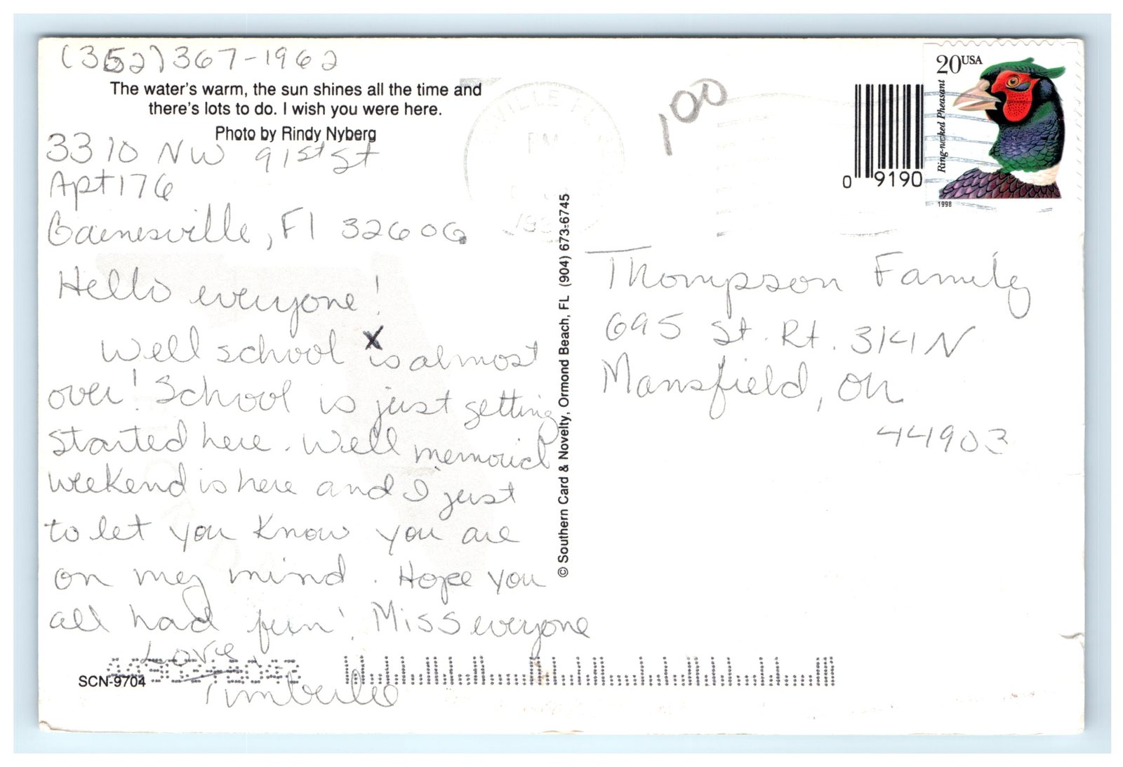 The photo was taken by Rindy Nyberg and printed by Southern Card Novelty in Ormond Beach, Florida, reflecting an authentic regional flair. The postcard is printed using chrome lithograph techniques on continental-sized paper (6 x 4 inches), enhancing the vivid colors and detail of the dolphin's features. On the back, a handwritten note adds a personal touch, dated around the late 1990s or early 2000s, as evidenced by the 1998 USA postage stamp featuring a Ring-necked Pheasant. This collectible postcard is an original piece ideal for collectors of Florida memorabilia, marine life imagery, or nostalgic travel ephemera.