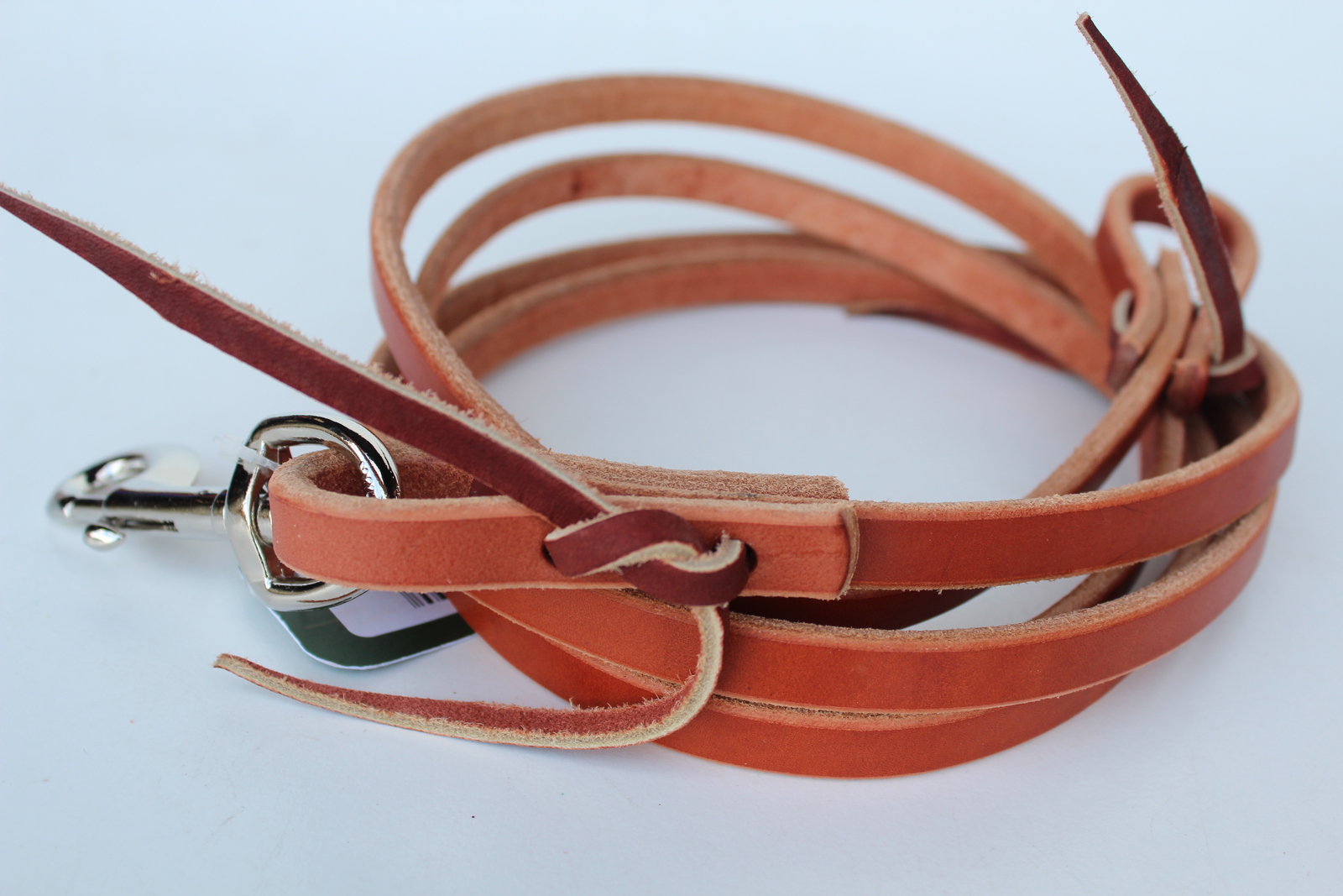 Made from qualit Harness Leather. This Roper Rein features a nickle plated snap on one end and waterloop tie ends. Measures 1/2" x 8'