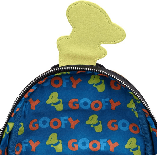 Goofy is too garsh darn excited to hold your essentials! This funny feller is a loyal sidekick and mini backpack. Applique, embroidered, debossed, enamel charm, and metal plaque details make this faux leather design by Loungefly unmistakably Goofy. Complete with adjustable straps, this backpack comes with a front zip pocket, main zip compartment, and 2 side pockets to keep your stuff safe and secure, even if you're as clumsy as Goofy!