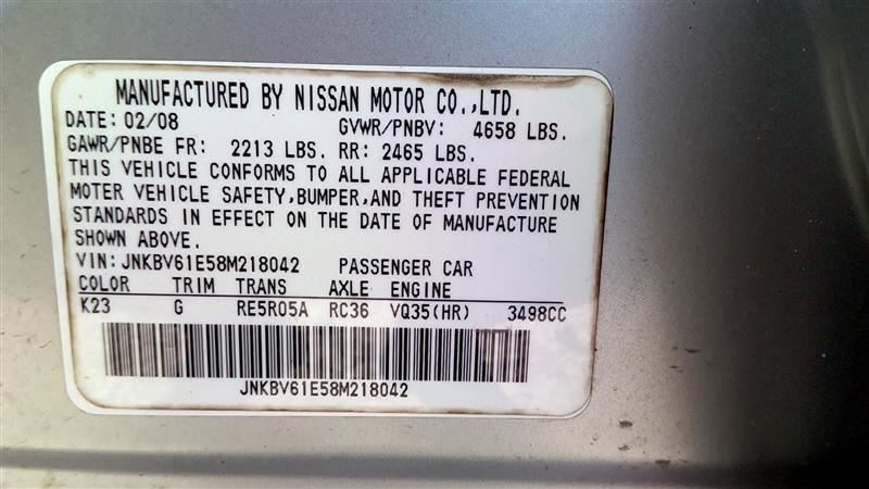 INFINITI G35 08 Driver's; lock and window, (4 Dr, Sdn), w/memory seat