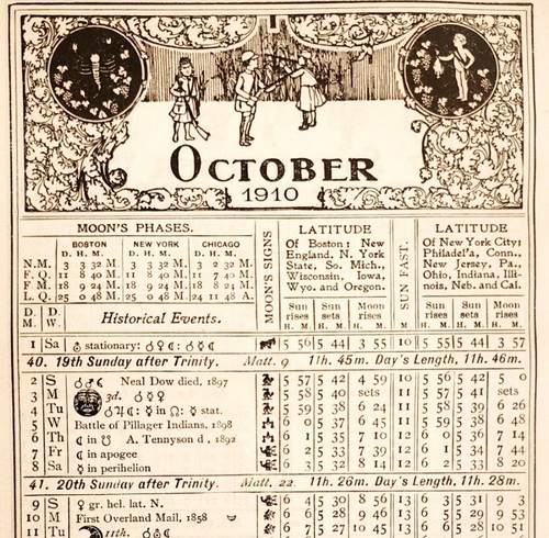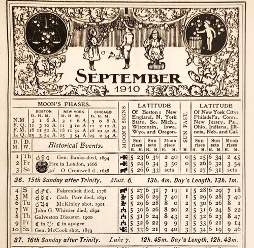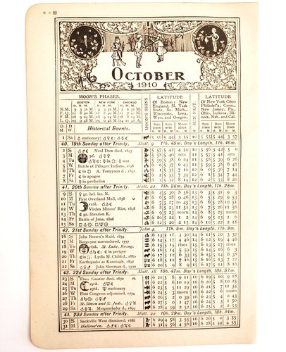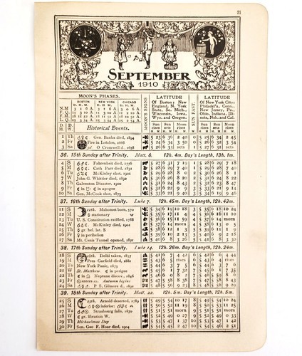 September October 1910 Calendar Page Moon Phases Sun Ephemera ADBN1eee
