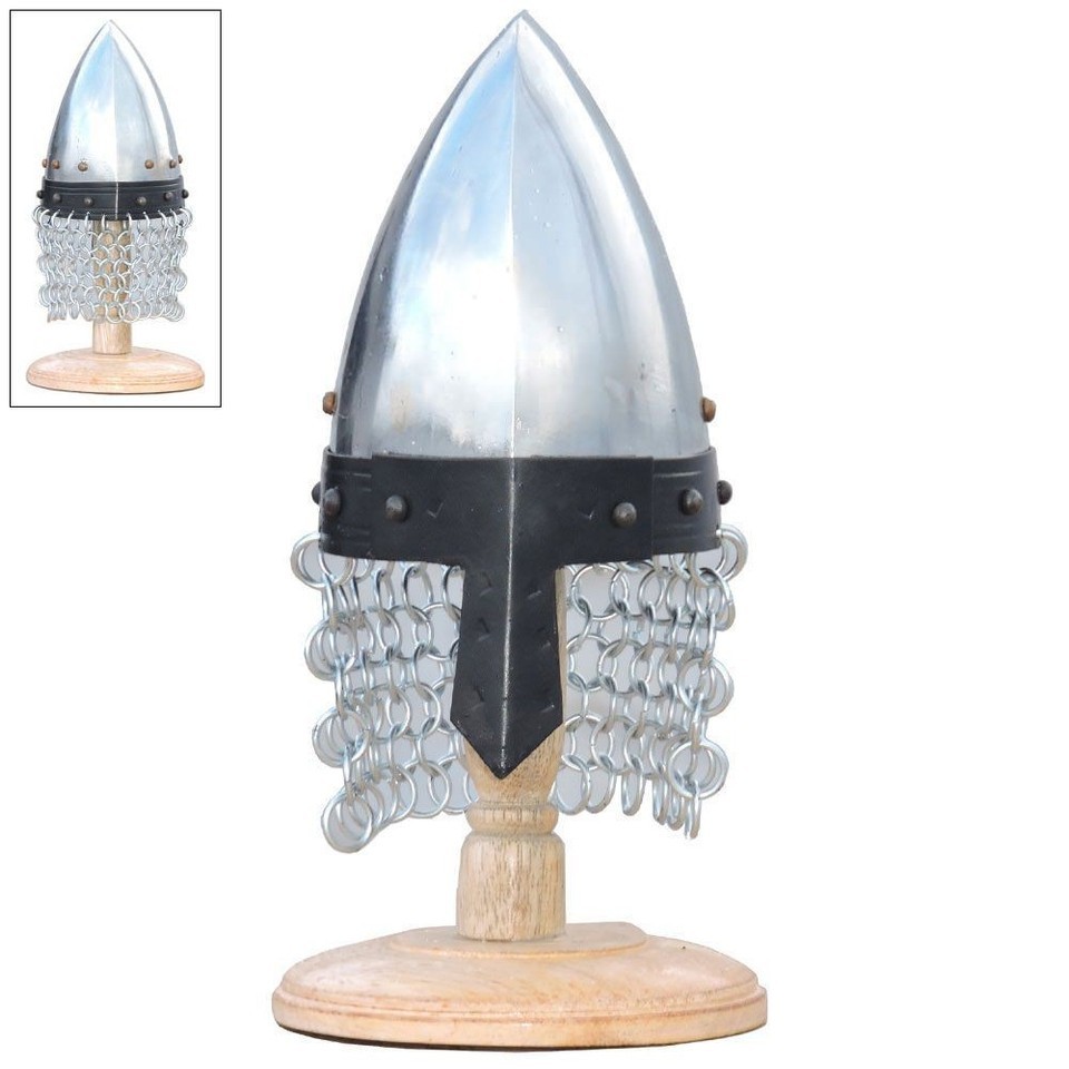 The Mini Normal Nasal Steel Helmet by SI is a decorative collectors' item that mimics the medieval theme. Made of steel with a silver color, this reproduction helmet comes with a wooden display stand and chain mail for added authenticity. The helmet is perfect for adding a touch of history and elegance to any collection or display.