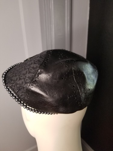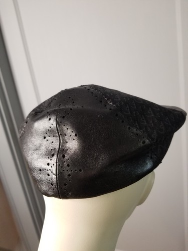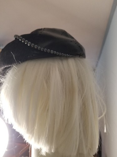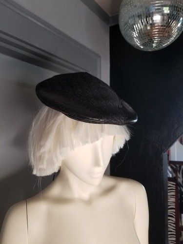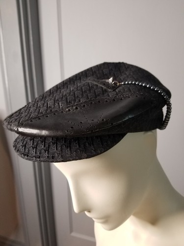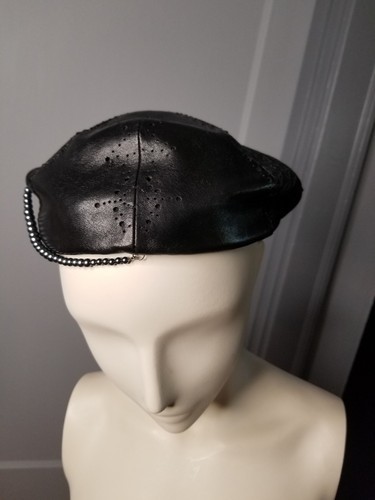 This has is in near mint condition being worn only once during Fashion Week. It has a D attached to faux pearls and fit in a tiny leather pocket. A very rare hat from a short lived collection.
