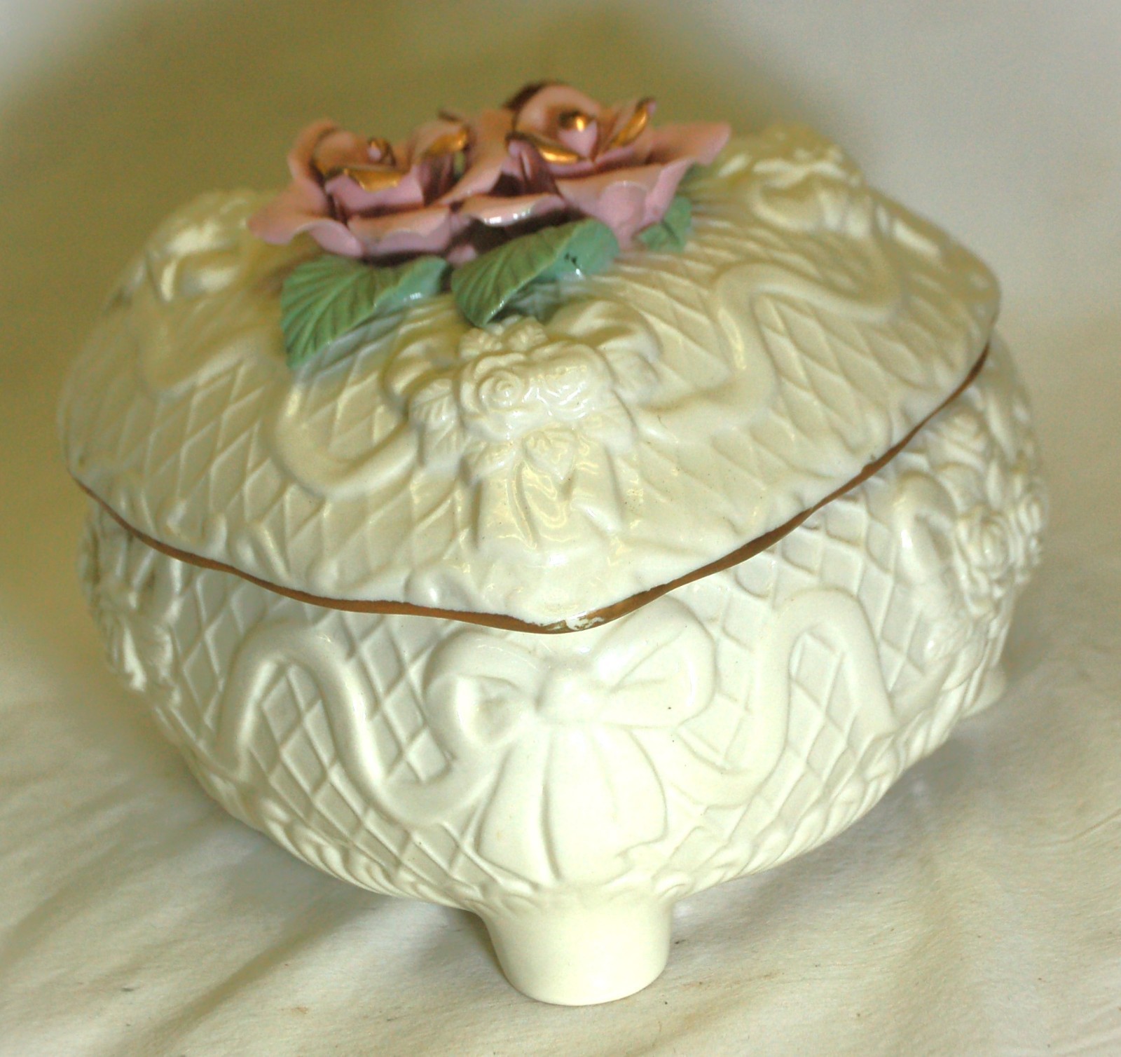 Porcelain Trinket Box 3D Pink Roses Gold Trim Decorative