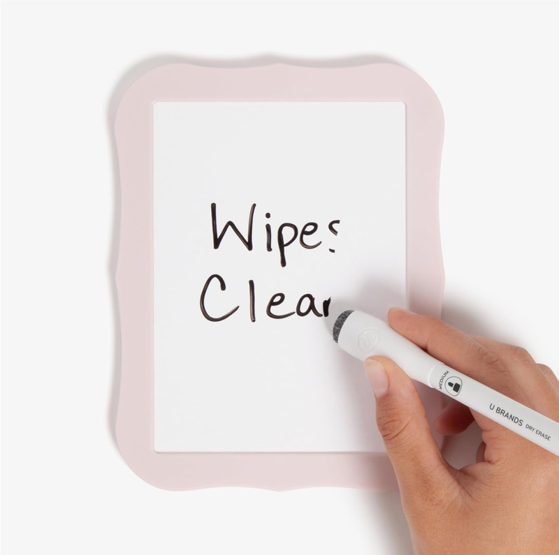 CHIC AND FUNCTIONAL: Kit includes a blush pink 4" x 5" x 3.25" magnetic cup to store pens, white 5.25" x 6.75" dry erase board for jotting down notes with included marker, 5.25" x 6.75" mirror for a quick glance, plus two magnets to post photos