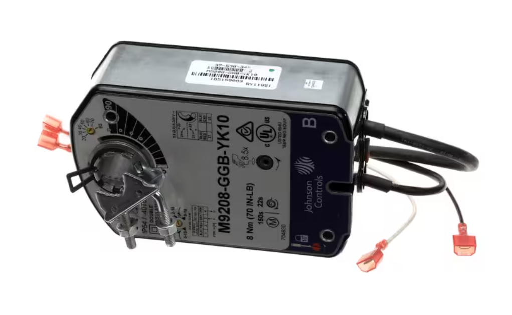 The York M9208-GGB-YK10 (37-538-345, 185159093) Damper Actuator Motor is a spring-return control motor designed for precise damper positioning in HVAC systems. Operating at 24 volts, this actuator delivers 70 inch-pounds of torque, making it ideal for medium-duty airflow and ventilation applications. The spring-return mechanism ensures dampers automatically revert to their safe position during power loss, enhancing system safety and reliability.