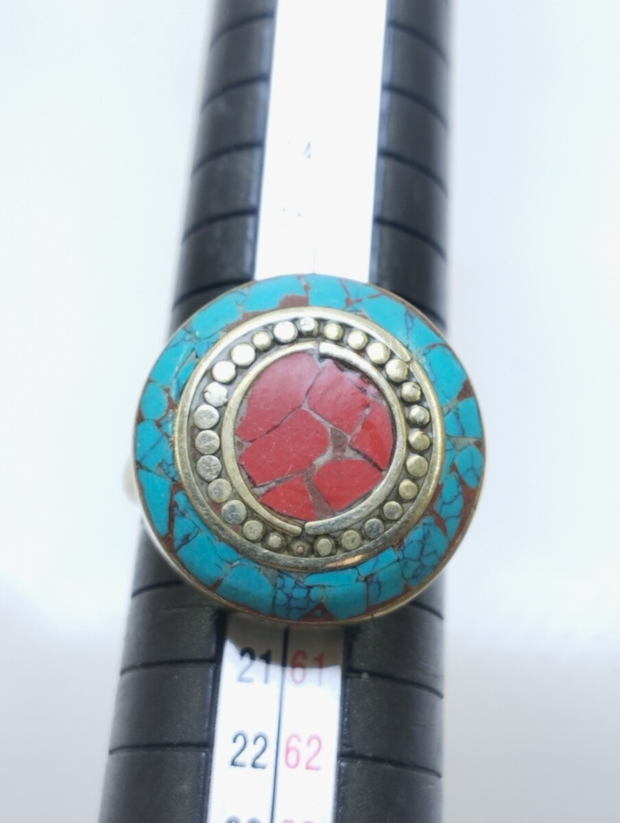 Crafted from solid brass, the ring features vibrant turquoise and red coral inlay in a circular mandala-inspired design. Perfect for lovers of ethnic, boho, or vintage-style jewelry, this bold statement piece reflects traditional craftsmanship from the Himalayan region.