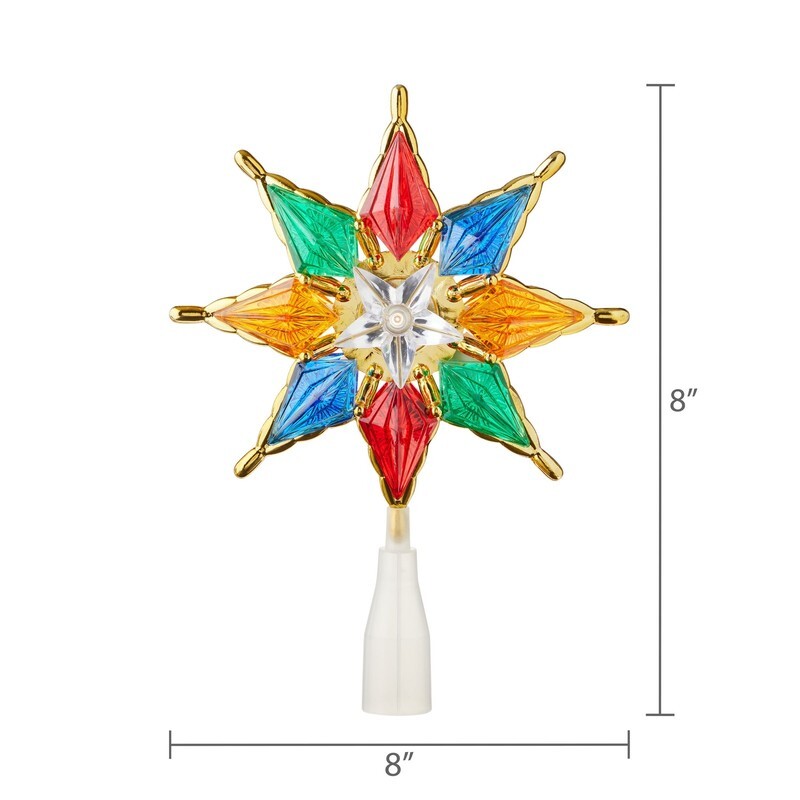 Holiday Time LED Star Christmas Tree Topper, Multicolor, 8" Measures 8 inches tall, great for small to medium trees Eight-point star design with colorful panels and gold trim Warm white LED lights add festive glow and charm Lightweight with easy-to-attach base for secure placement Perfect for traditional, nostalgic, or colorful holiday decor 30" lead wire