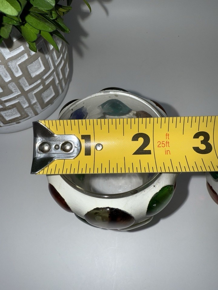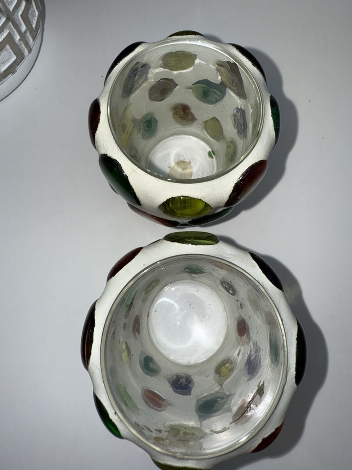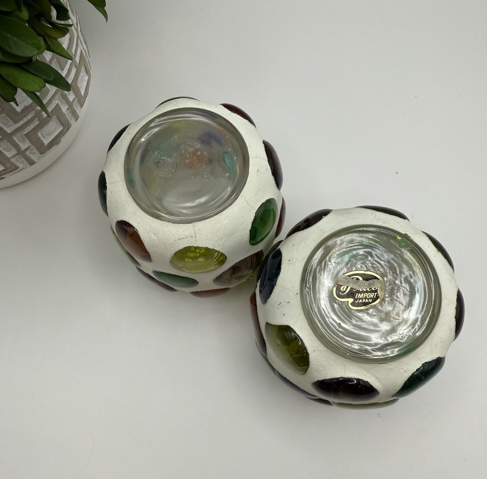 A joyful splash of mid-century color ? this vintage pair of Japanese art glass candleholders features luminous glass ?gems? in cobalt, amber, green, and ruby, set into a creamy white textured base. Each piece catches the light like confetti on glass, radiating playful retro charm.