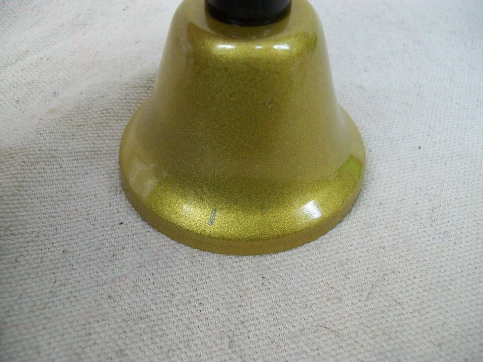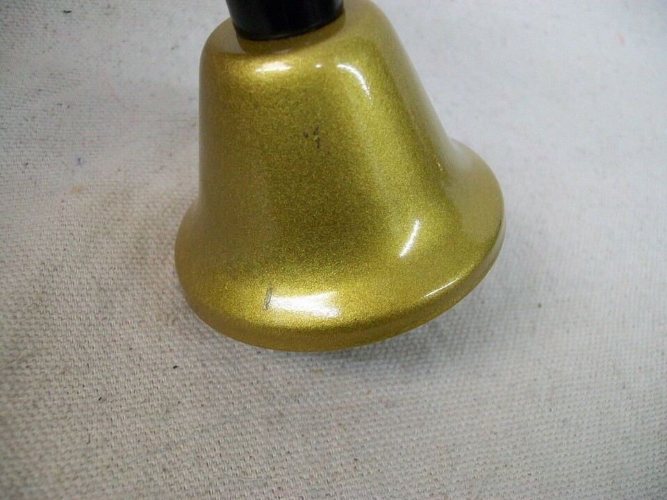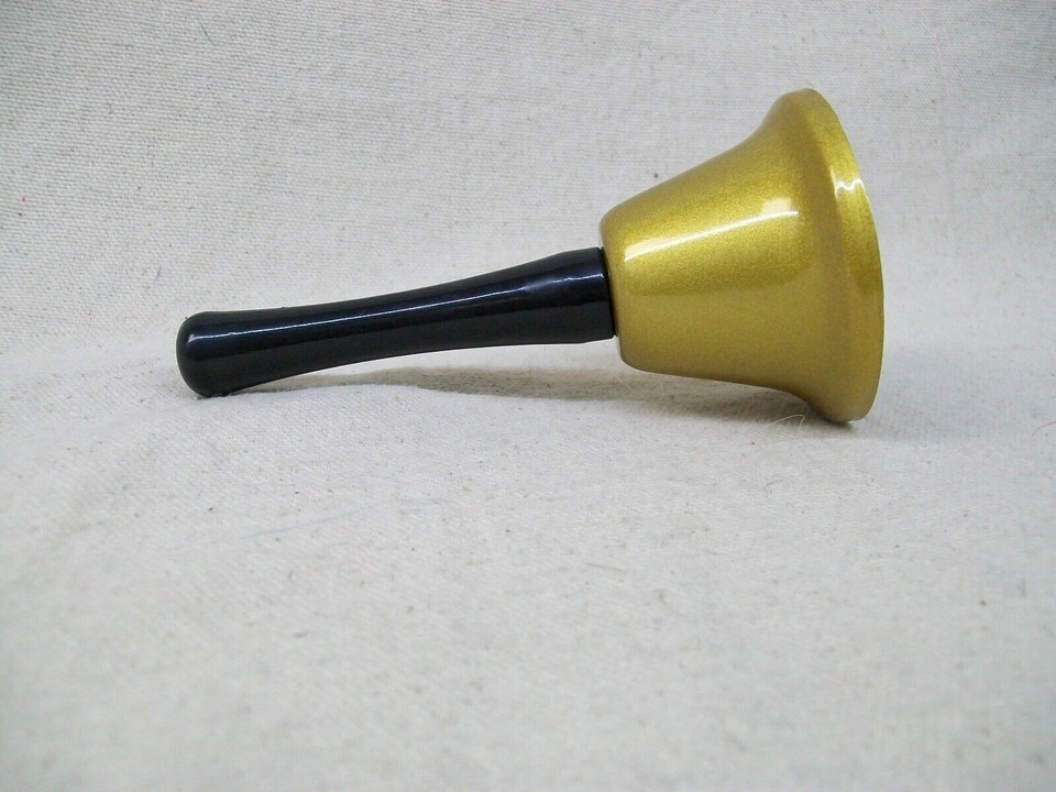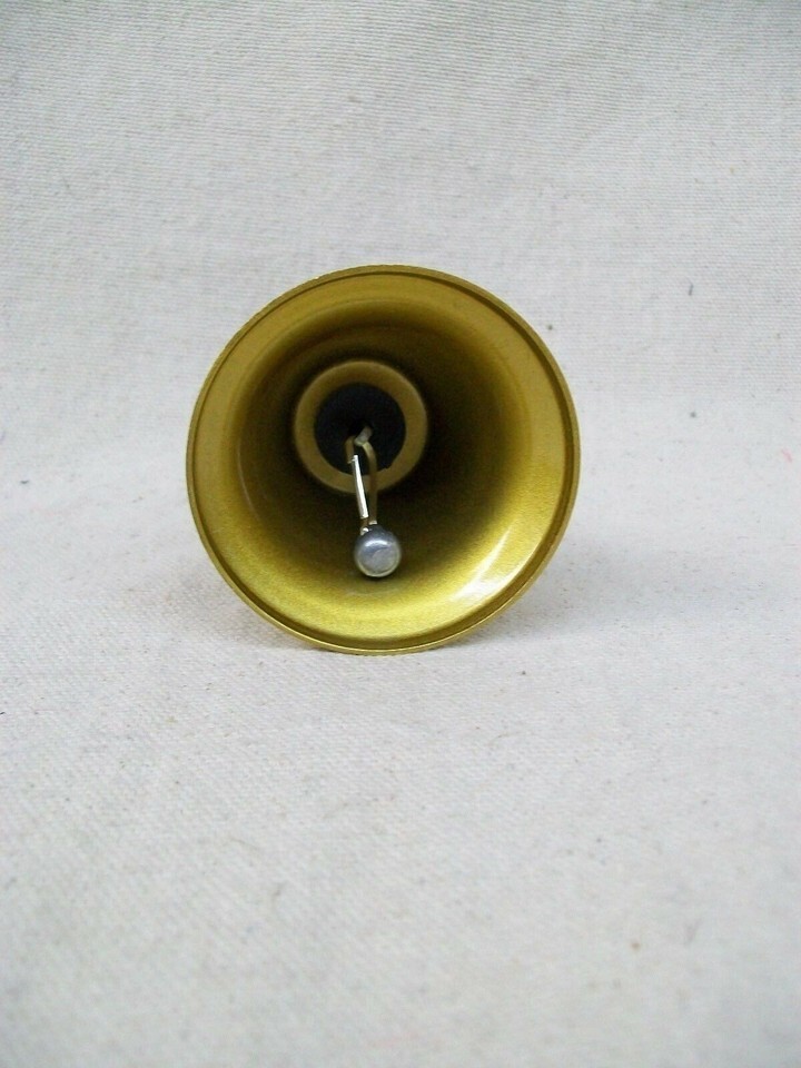 Small Handheld Bell Costume Prop Accessory or Holiday Decoration. Black Plastic Handle. Metal Bell. For use by ages 14 and up. Approx. Size: 5.25" tall end of bell to top of handle. End of bell approx. 2.5" round. Has small imperfections in the finish of the bell. Please see all photos. SOLD AS IS. Could be used for many things: Holiday Greeter, Christmas Caroler, Donation Collector, Costume Accessory for Santa Claus, Mrs. Claus, Elf, Toymaker, Bell for Service, Bell for Sick Child or Adult.