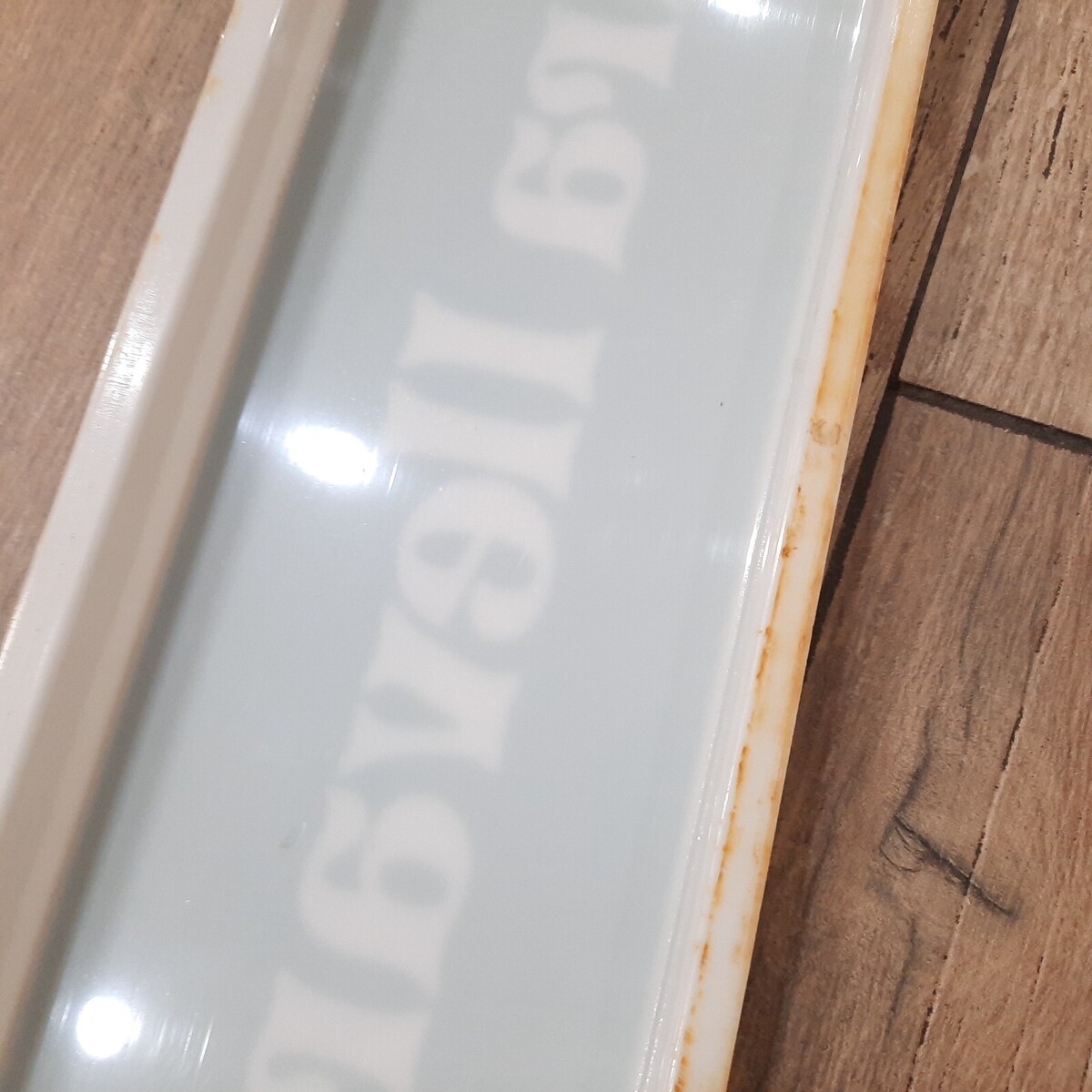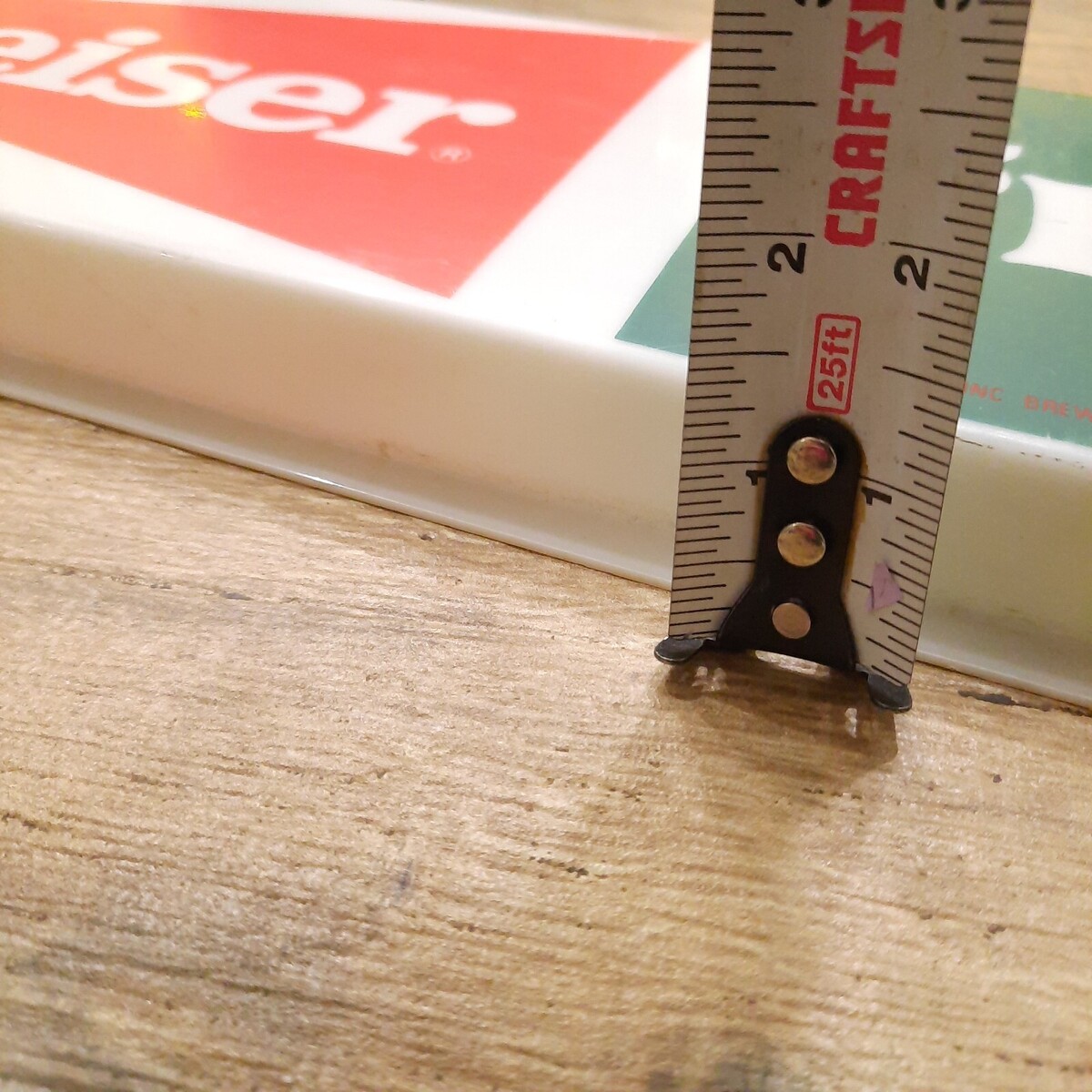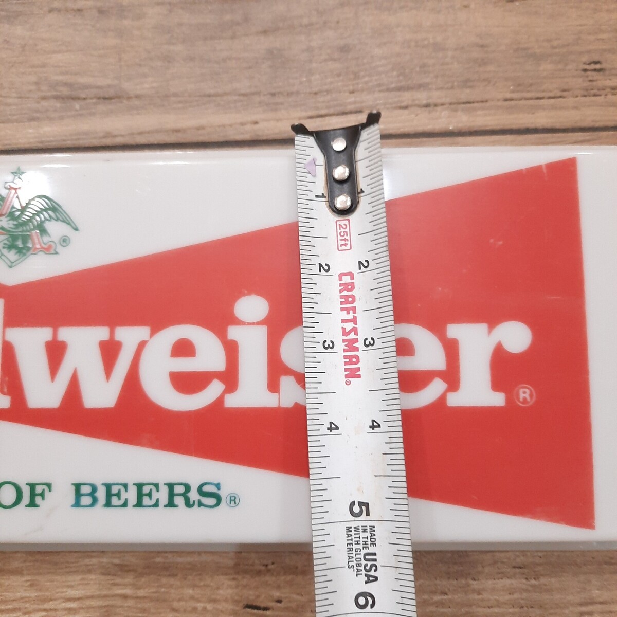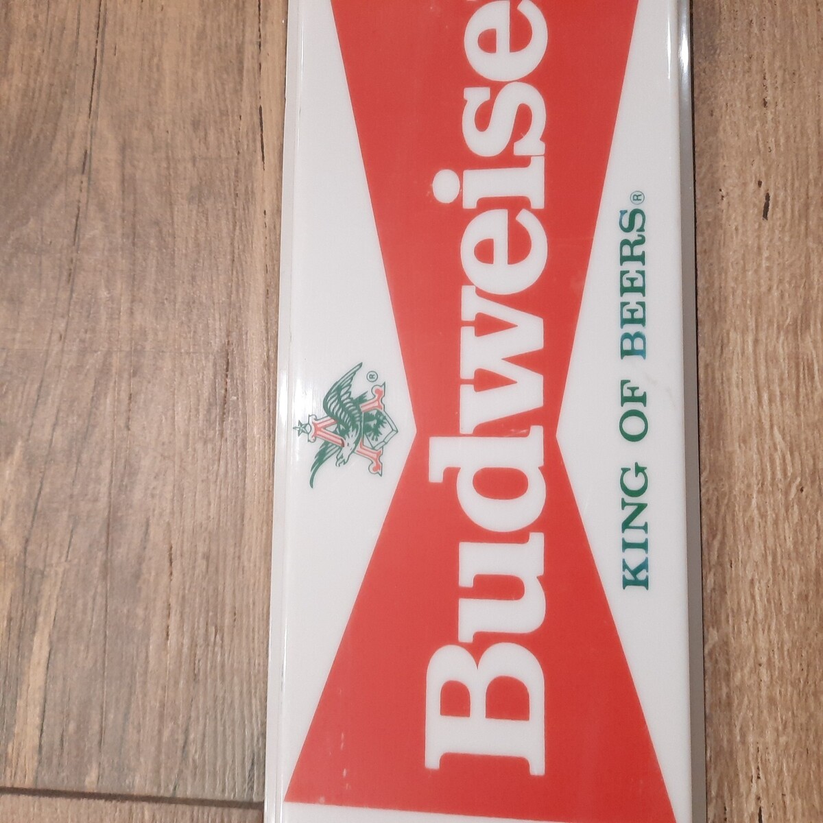 Plastic sign insert from a light. Does NOT include light or light box. As as is. Some cracking/missing edge as shown. Wear/scratches/marks as shown. See pics. Lightweight plastic. Says WE HAVE COLD BUDWEISER TO GO in Spanish.