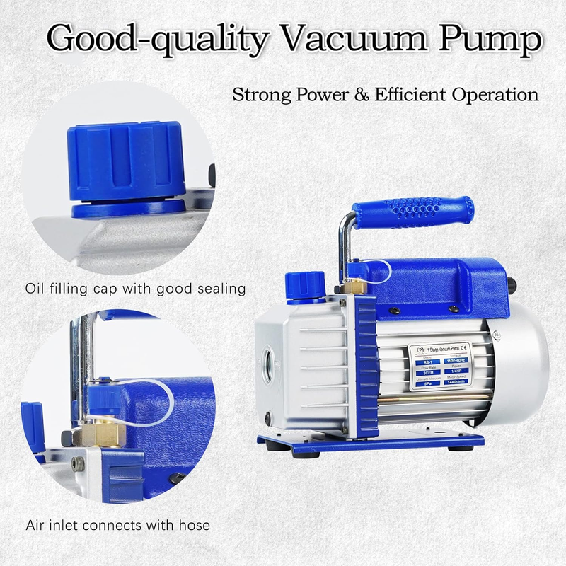 Good-quality Vacuum Pump: Our vacuum pump is designed to have high efficiency and low noise for maintaining air conditioning systems. The aluminum housing makes the pump light-weight and durable, the thermally protected motor is applicable for long-term operation