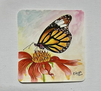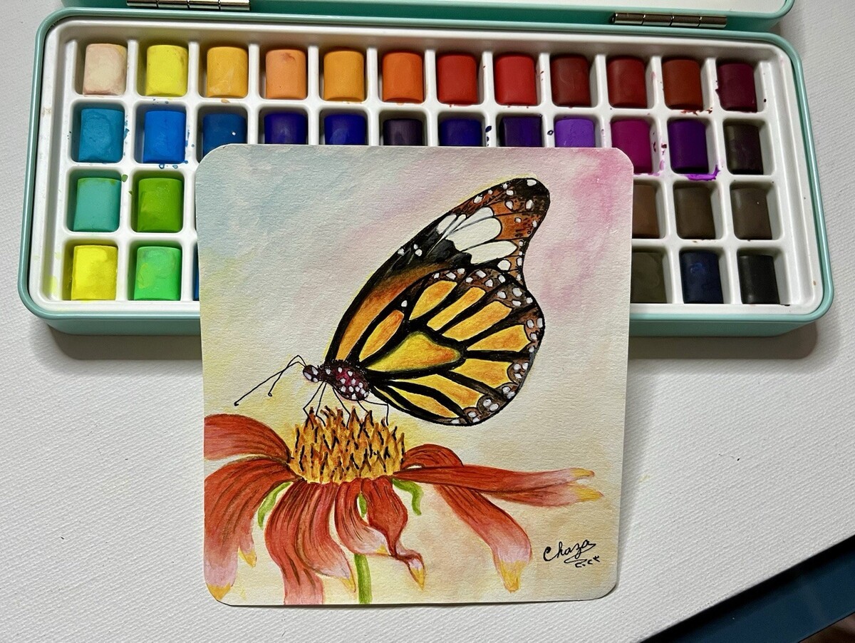 Original Hand painted Miniature watercolor painting of a Butterfly On A Flower