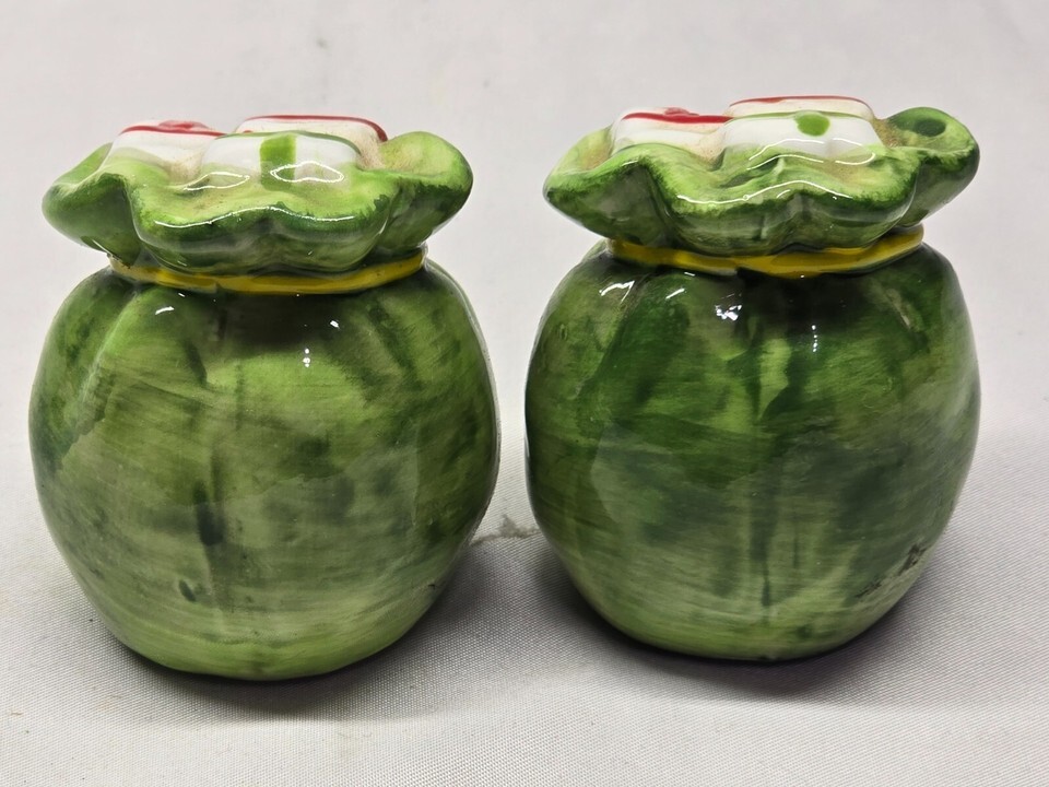 Vintage Little Green Gift Bag Sack Salt & Pepper Shaker Set - Christmas Holidays