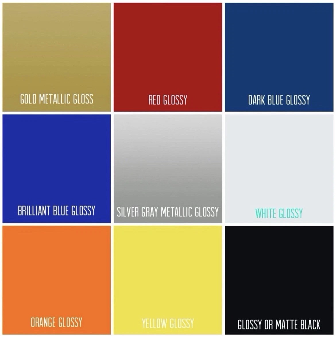 (Glossy Red - Glossy Yellow- Glossy White -Glossy Black -Matte Red -Matte Black -Glossy Blue - Glossy Silver/Grayish Glossy Orange)