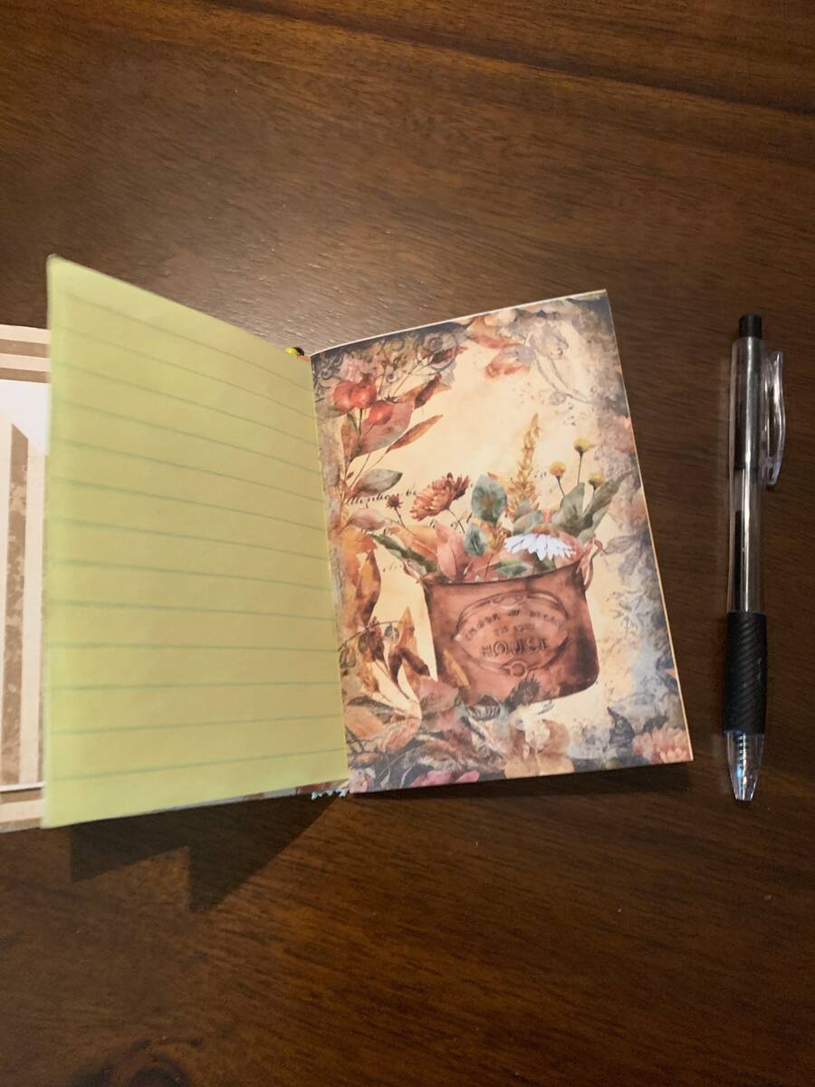 Comes with several pieces of ephemera. This little journal measures about 3.5? x 5? and is ready for you to add your own imagination. Made from heavy card stock. About 30 pages front/back. This would make a cute little stocking stuffer/gift. Only one left!