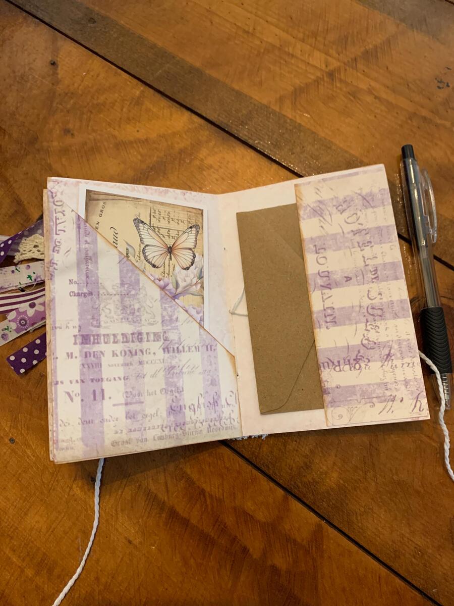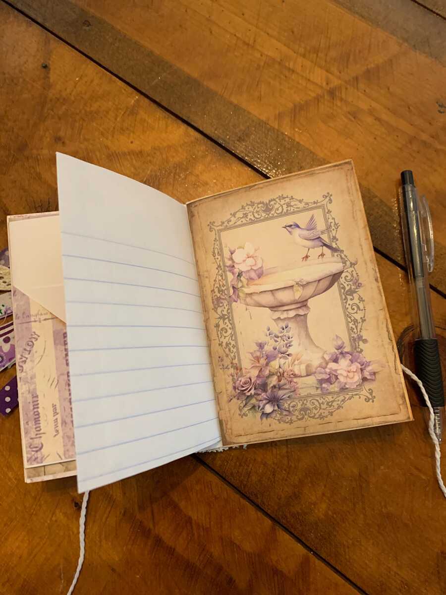 Comes with several pieces of ephemera. This little journal measures about 3.5? x 5? and is ready for you to add your own imagination. Made from heavy card stock. About 30 pages front/back.