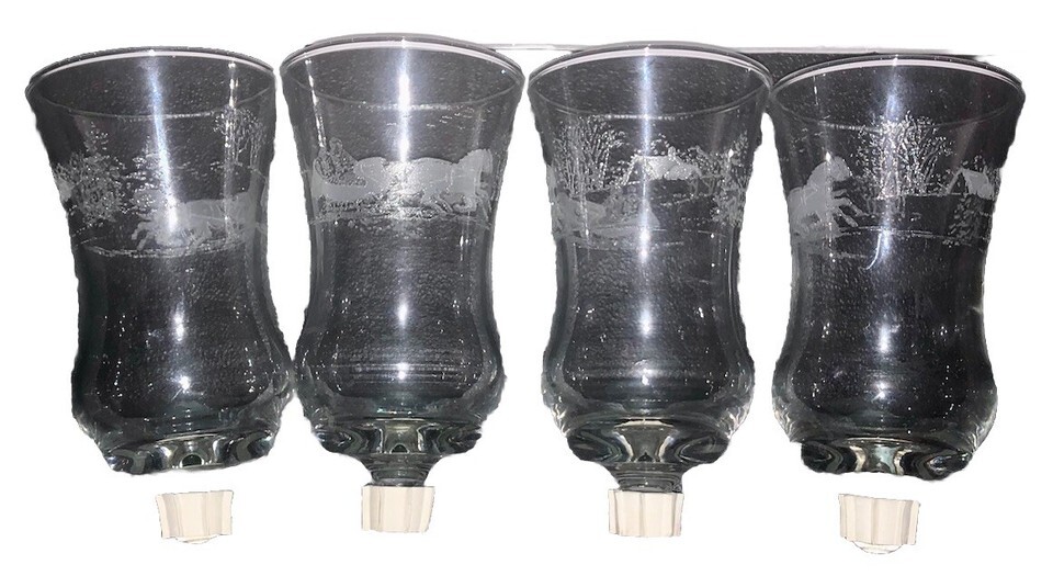 This vintage Home Interiors set includes 4 large round glass votive cups featuring an etched Winter Wonderland horse carriage design. Clear glass. Perfect for Christmas, the Colonial-style candle holders depict a horse-drawn sleigh scene. Made in the USA they come in their original box.