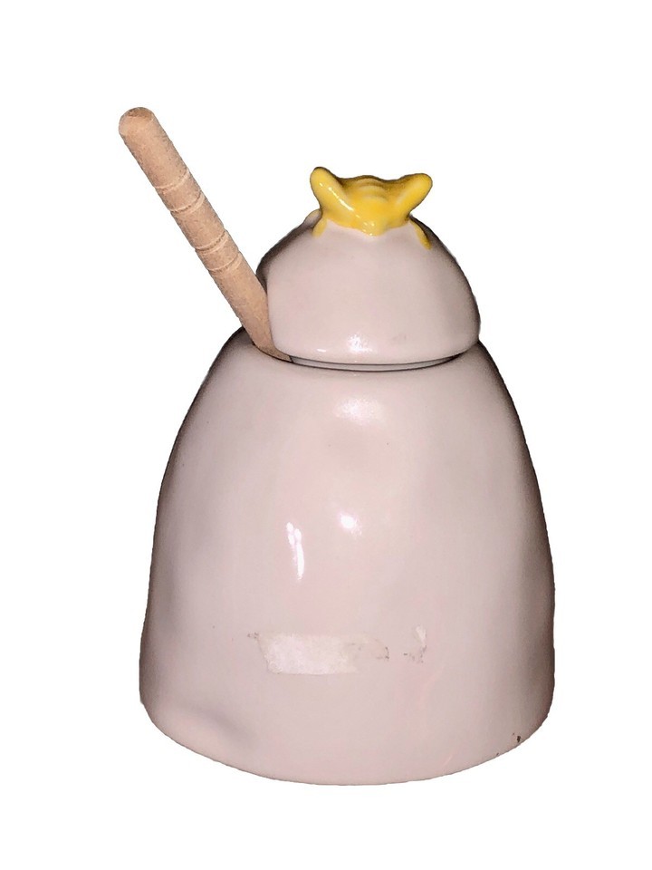 Rae Dunn Ceramic Bumble Honey Pot with Wooden Honey Dipper & Yellow Bee Lid 5”