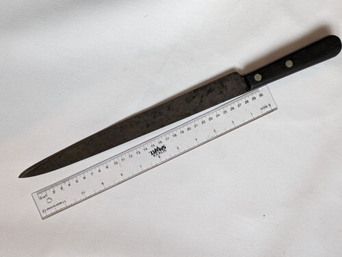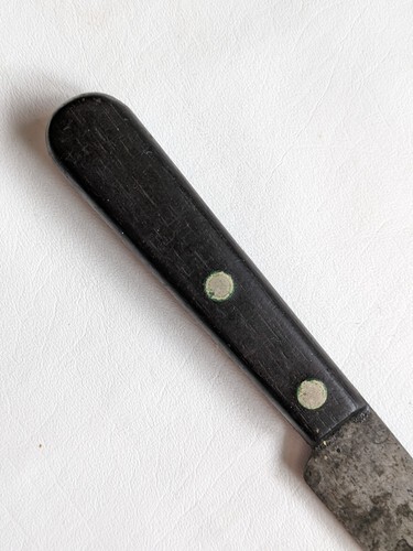 Ce couteau a trancher de chef Lamson Goodnow MFG Co vintage est un incontournable pour tout collectionneur ou passionne. Fabrique aux Etats-Unis dans les annees 1950, ce couteau presente un manche solide et un ton de bois brun fonce pour une sensation americaine classique. Mesurant 17 pouces de longueur avec une lame de 12 pouces, ce couteau est parfait pour trancher et couper en des dans la cuisine. Le couteau a une demi-soie et porte le nom et le modele de la marque Lamson, ce qui en fait un ajout unique et precieux a toute collection. L'ensemble comprend un couteau et est parfait pour ceux qui apprecient les couverts de qualite. Que vous l'utilisiez dans la cuisine ou que vous l'affichiez dans votre collection, ce couteau a trancher de chef Lamson vintage impressionnera a coup sûr.