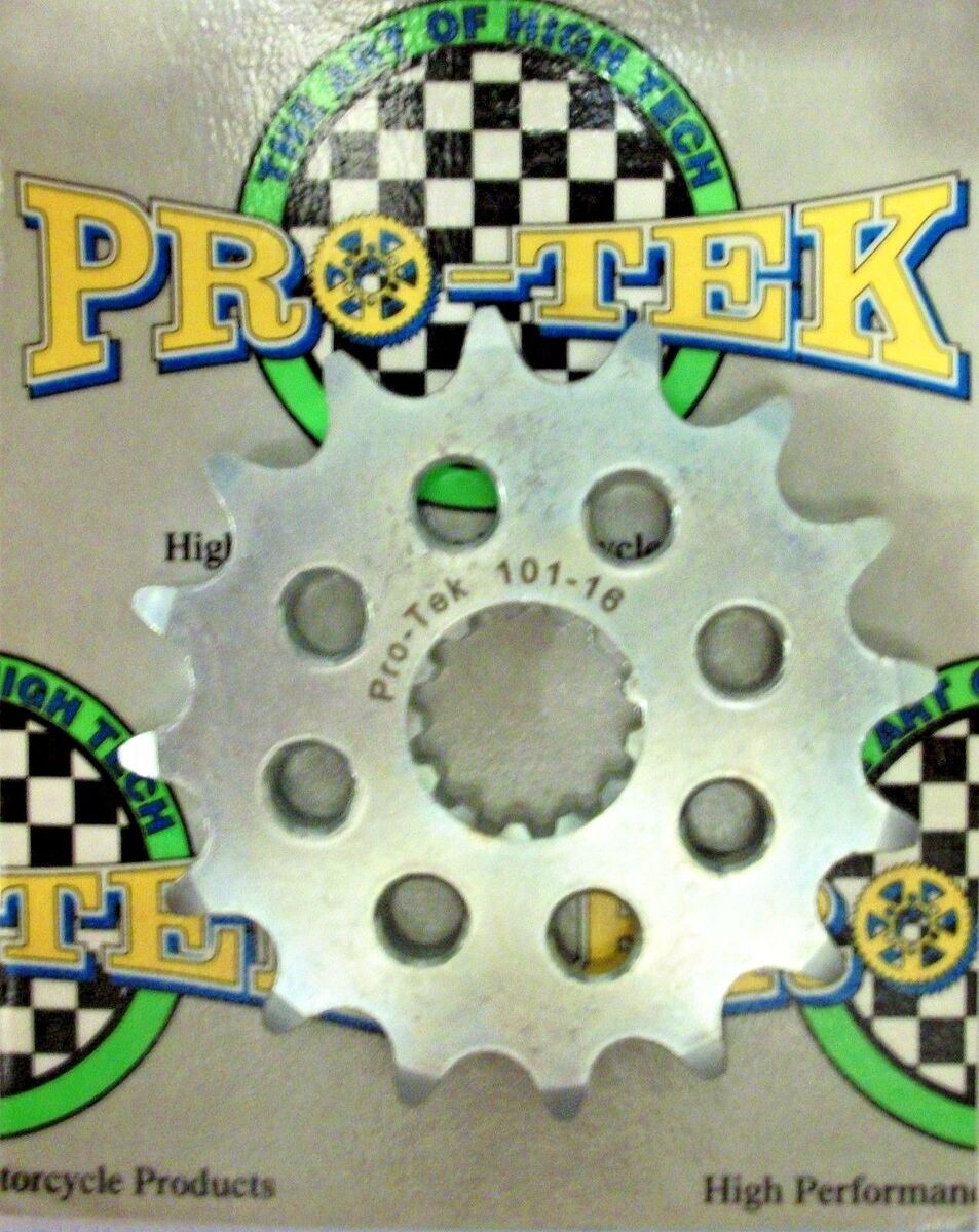 Pro-tek front sprockets are completely CNC machined to exact tolerances from 4140 nickel-chromoly steel resulting in a quality product. None of the Pro-tek front sprockets are gear hobbed, but are lightened with drilled holes to save on rotating mass. Every lb of rotating mass equates to a 4 lb weight reduction. The sprockets are then case hardened to Rc 58-60 and finished with a zinc plating for added durability and protection from corrosion. Made in the USA, normally retail for $34.95. This is for a 530 Pitch front sprocket 13, 14, 15, 16, 17 or 18 tooth.