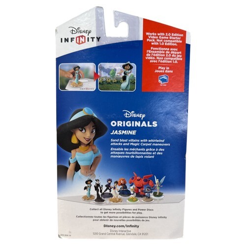 The product is a Disney Infinity Jasmine Originals 2.0 Edition Figure, part of the Disney Infinity 2.0 video game series and product line. It features the character Jasmine from Disney, designed for use in the Disney Infinity video game.