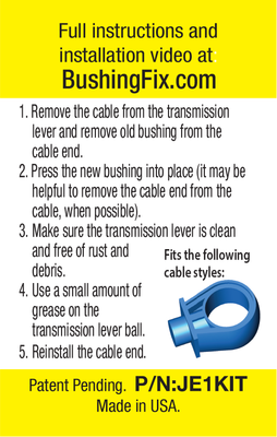 The kit replaces the bushing on the interior end of the cable located at the base of the gear shifter.