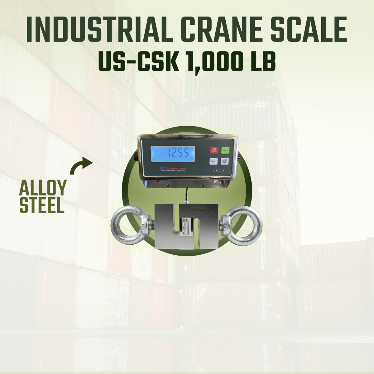 The USA Measurements US-CSK 1000 lb. crane scale comes with everything you need to quickly set up and start weighing items. The kit includes our US-7011 indicator, an S-type load cell, two eye hooks, a power adapter, AAA batteries, and a user manual. The S-type load cell features an 11' braided cable and alloy steel construction, along with standard 1/2" 20 thread eye hooks for secure connections.Specifications:Capacity 1,000 lbAccuracy 0.1 lbSize: 8.5? x 9? x 2?Load Cell Material: Alloy SteelCable Length: 11?LB/KG SelectableTare Range: Full CapacityPower: AC Adapter or BatteriesOptional Thermal PrinterWarranty: 1 YearNon-NTEP (Not legal for trade) What?s Included: (1) Top Eye Hook(1) Bottom Eye Hook(1) Tension Load cell(1) LCD Bright Digital Display(1) Manual(1) Factory Calibration Models: US-CSK-1K Crane Scale 1,000 lb x 0.1 lbUS-CSK-2K Crane Scale 2,000 lb x 0.2 lbUS-CSK-3K Crane Scale 3,000 lb x 0.5 lbUS-CSK-4K Crane Scale 4,000 lb x 0.5 lbUS-CSK-5K Crane Scale 5,000 lb x 0.5 lbUS-CSK-10K Crane Scale 10,000 lb x 1 lbUS-CSK-20K Crane Scale 20,000 lb x 2 lb Resources: US-7011 Owners Manual https://youtu.be/tVu7KLCrYKo?si=RrTrun6H3iO-oieQ
