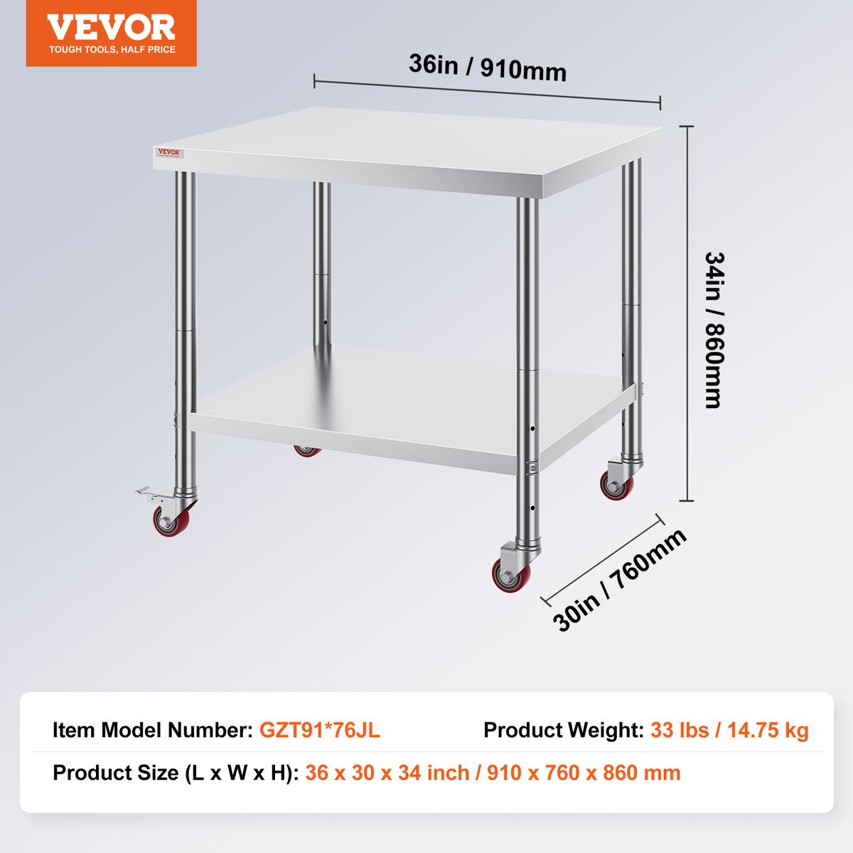 VEVOR Stainless Steel Work Table 36x30x34 in, Adjustable, 700 lbs Load Capacity