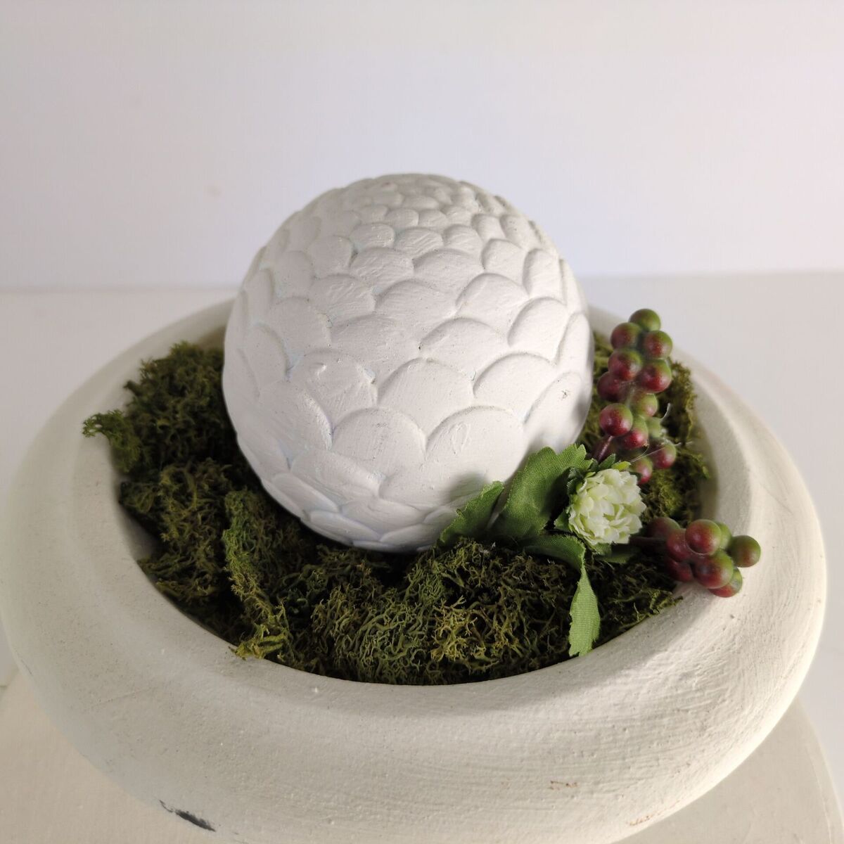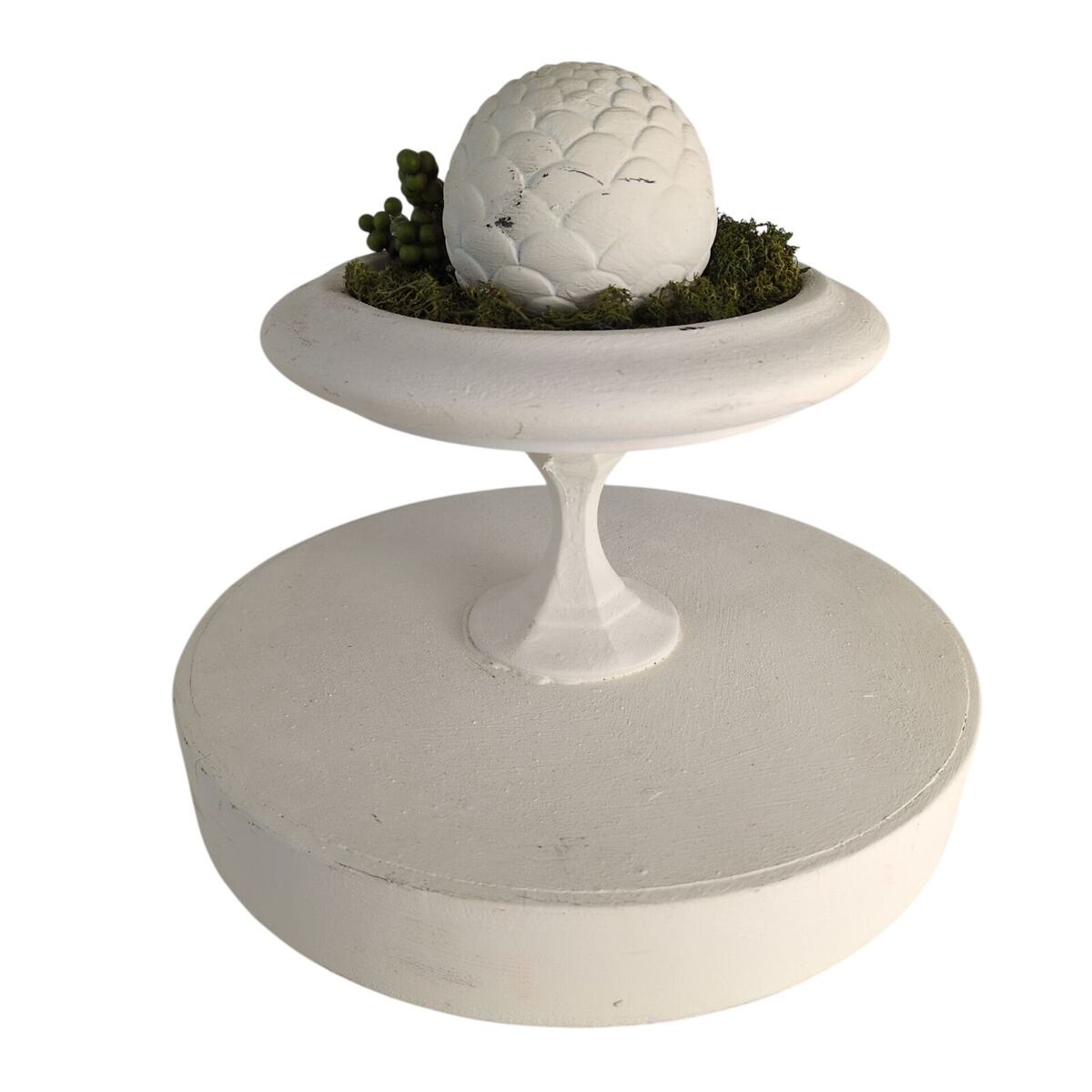 Decorative centerpiece with a rustic, slightly distressed chalk paint finish in off-white. It features a 12" wide base, an upcycled painted candlestick riser and a top adorned with a painted pinecone ball and moss accents. Measures 10" tall to the top of the ball. Handmade from upcycled parts - a one-of-a-kind!