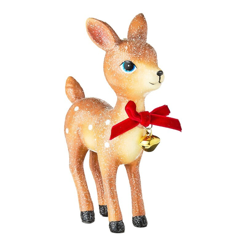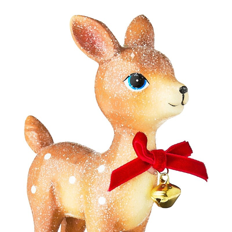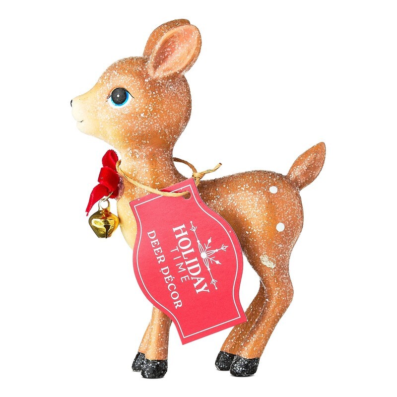 Holiday Time Standing Deer with Bell Christmas Tabletop Decoration, Brown, 5.31" Features a charming deer design with festive details Adorned with a red bow and golden bell Glittery finish adds a snowy touch Perfect size for mantels, tabletops, or shelves Durable decoration to enjoy year after year