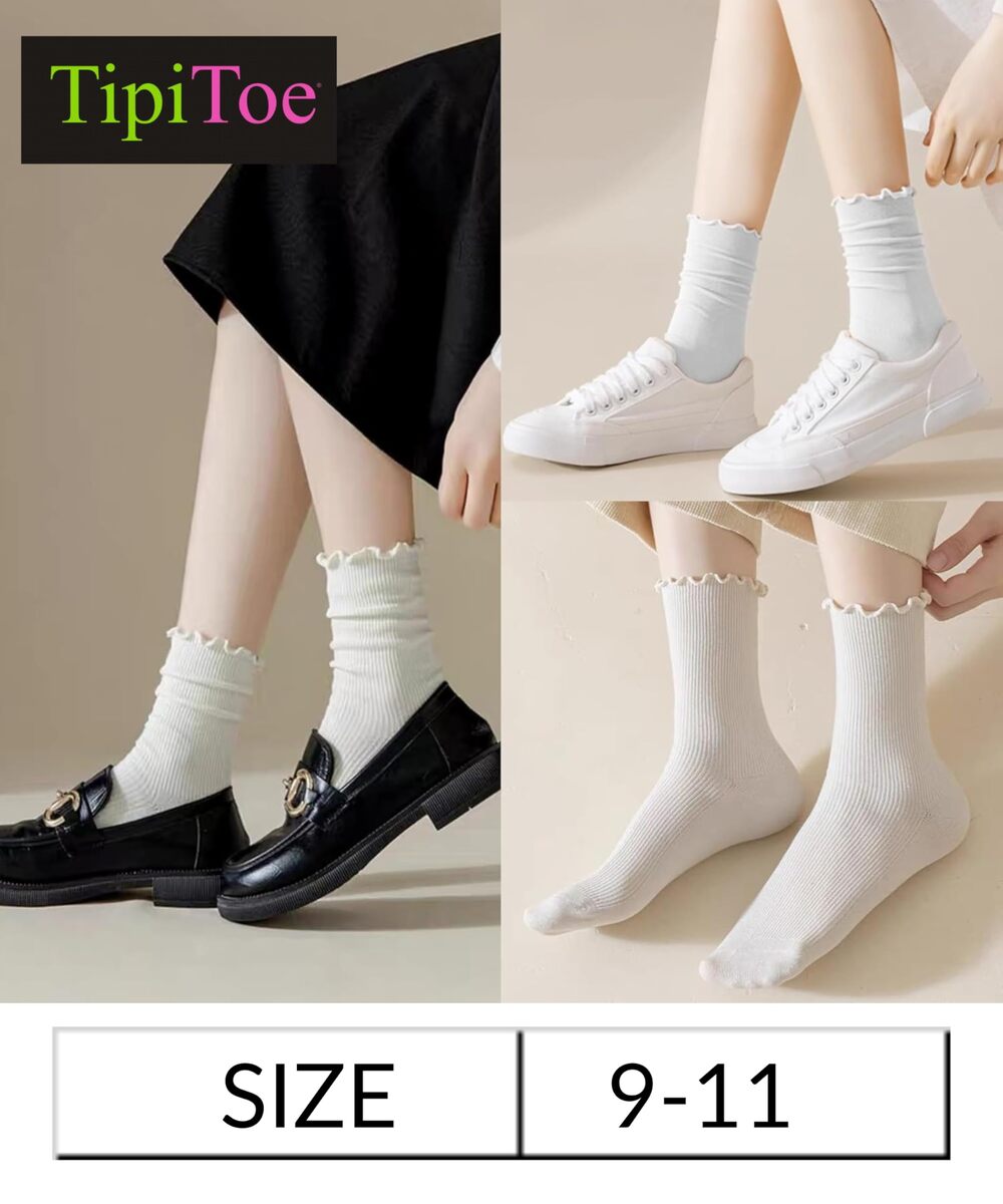 Product description: Step up your sock game with Tipi Toe Women?s Ruffle Crew Socks ? where comfort meets everyday style. Designed with a soft, lightweight fabric, these socks keep your feet fresh and cozy from morning errands to evenings out. The playful lettuce edge and ruffle cuff add a chic, feminine touch that pairs perfectly with sneakers, loafers, or ankle boots. Whether you?re dressing up for work, heading to brunch, or simply lounging at home, these socks deliver the right balance of style, comfort, and versatility. With six pairs in every pack, you?ll always have a fresh option ready to match your look.