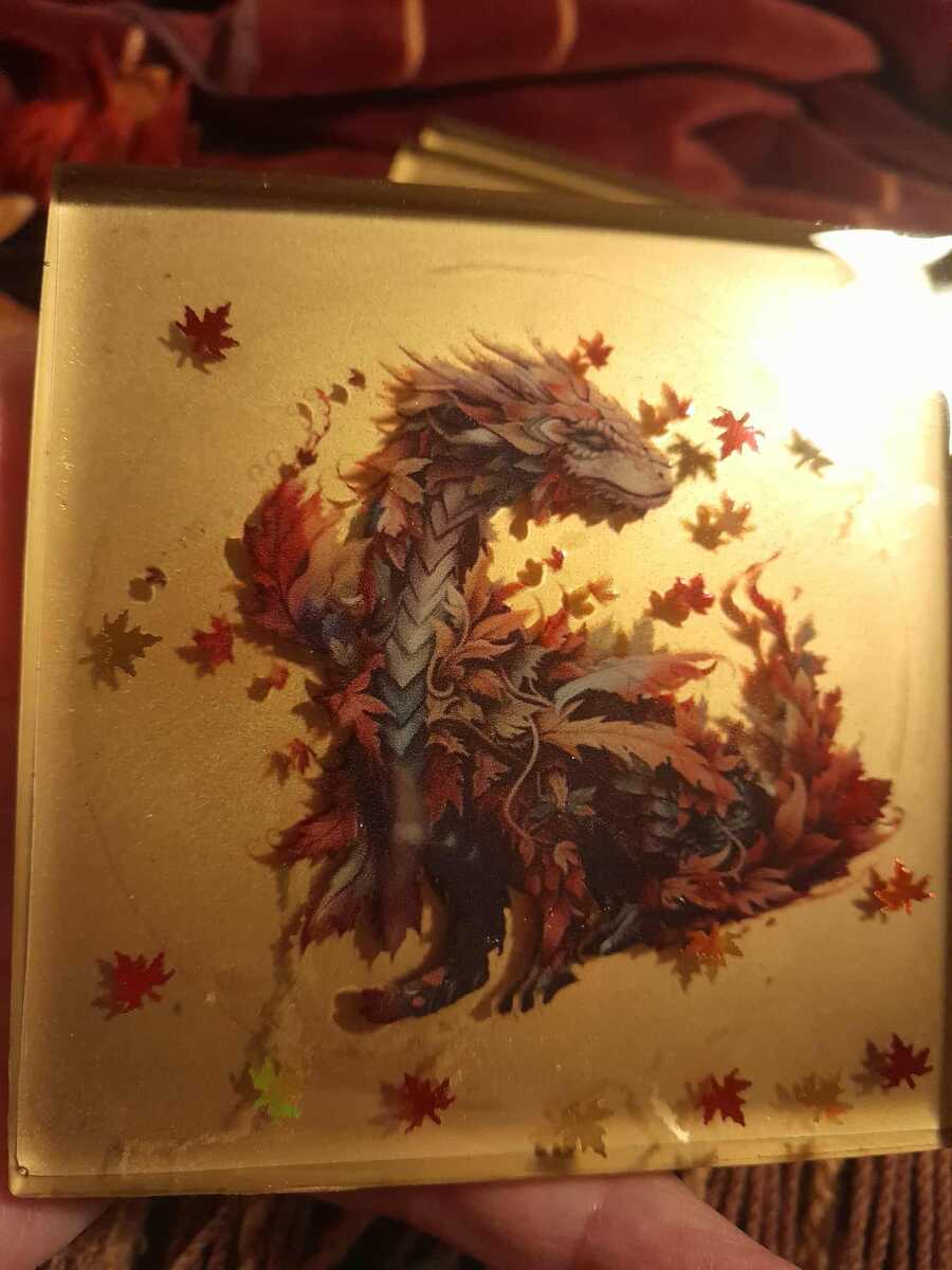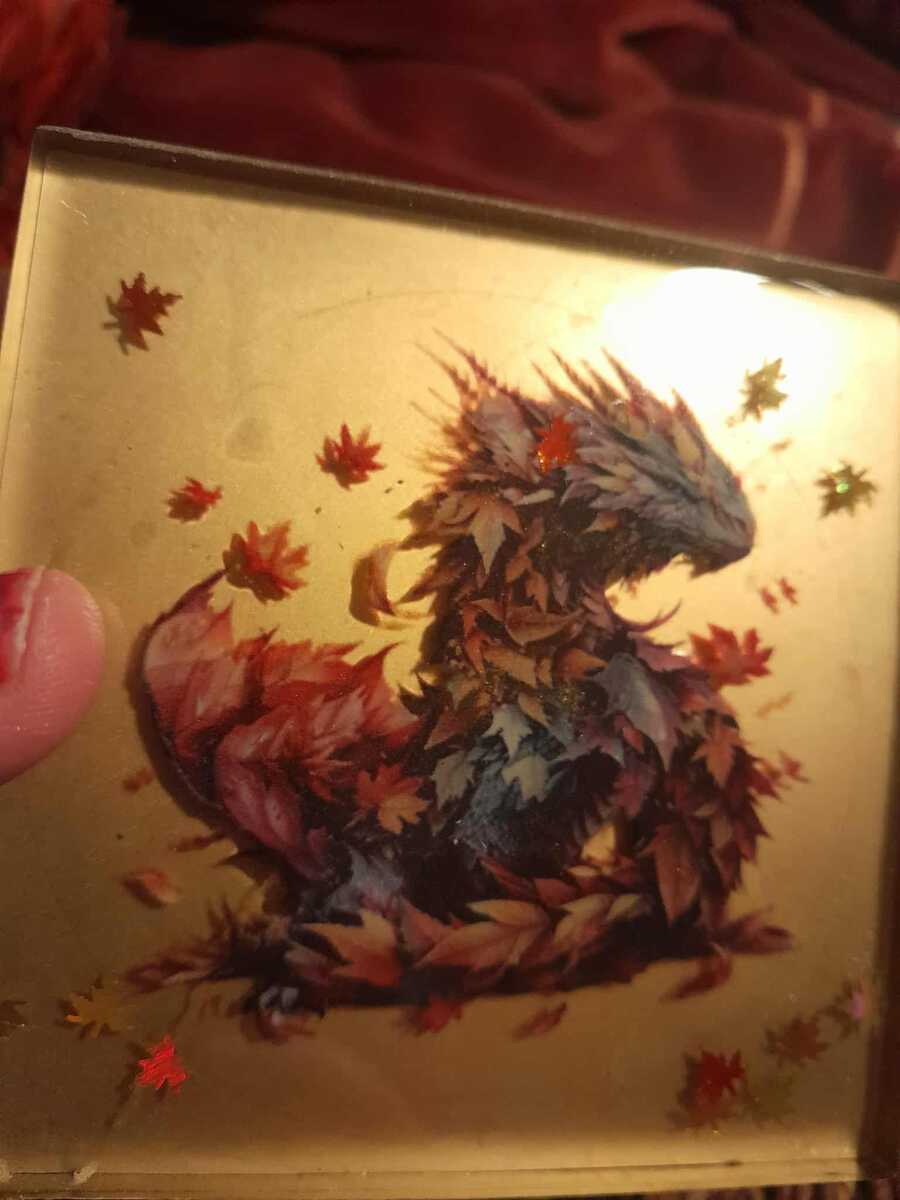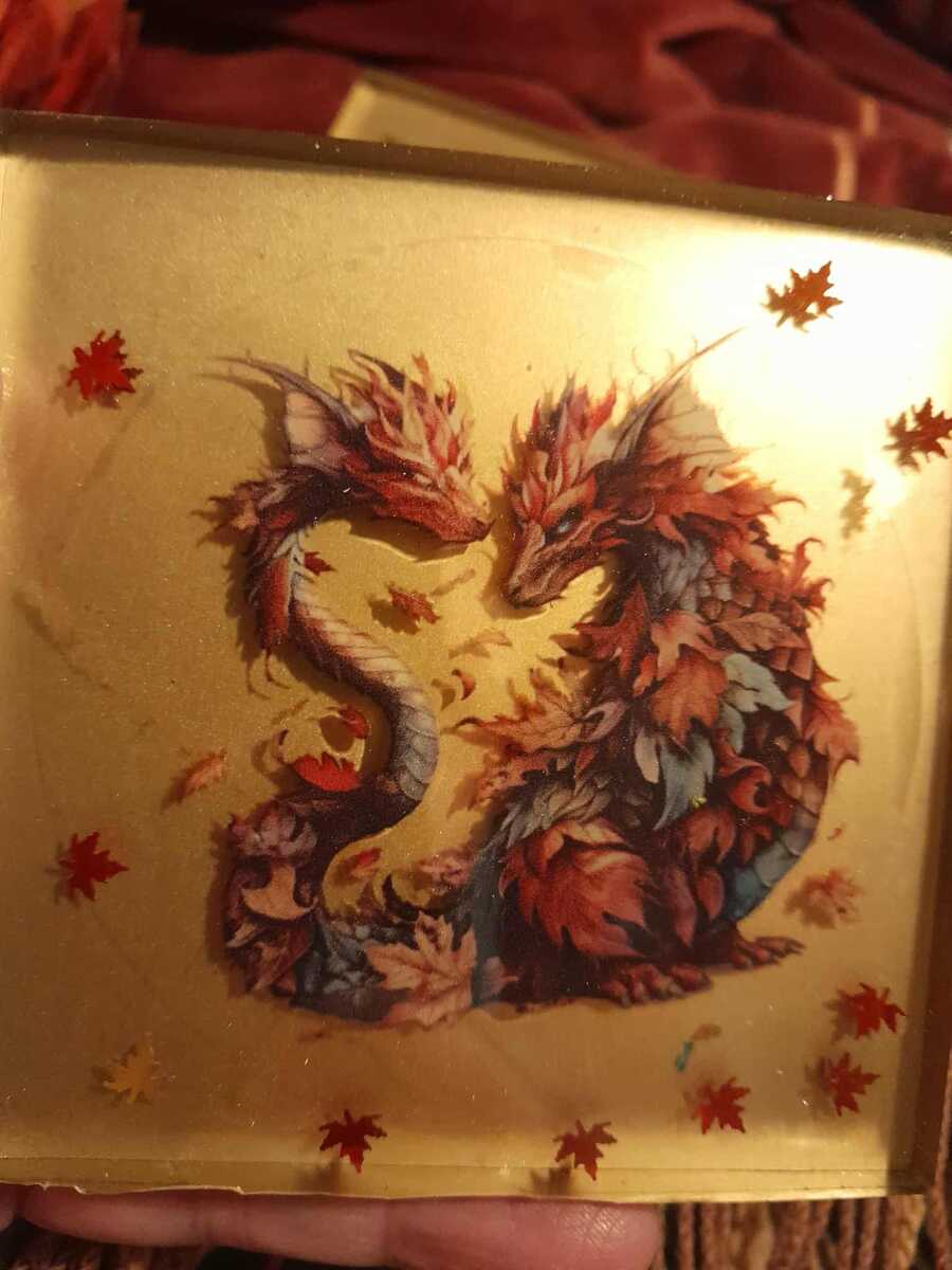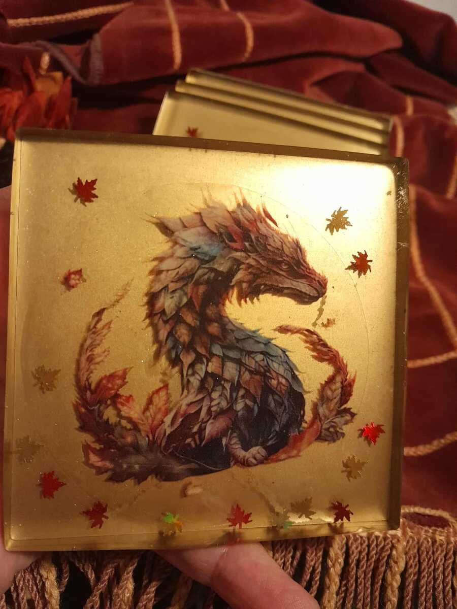 Coaster Set of 4 and Holder FALL LEAVES DRAGONS Unique Mixed Media Gifts Handmad